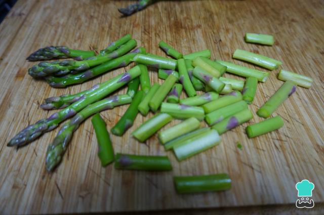 Corta las puntas de los espárragos y sepáralas. El resto, córtalo en trozos similares. Si no son muy grandes no será necesario hacer tantos trozos, pero si son son muy gordos los espárragos es mejor cortarlos por la mitad y luego en trozos para que se cocinen correctamente.