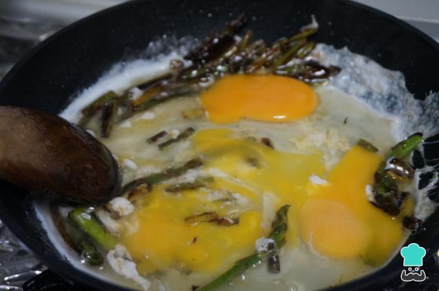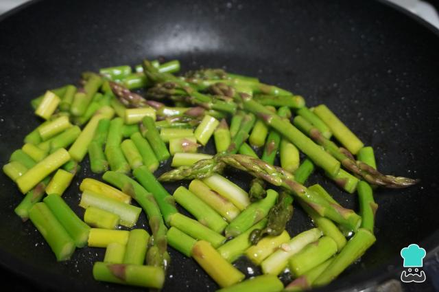 Calienta una sartén con un chorro de aceite a fuego medio, pon los espárragos trigueros y saltéalos durante 5 minutos vigilando que no se quemen. Han de quedar tiernos para poder hacer el revuelto.