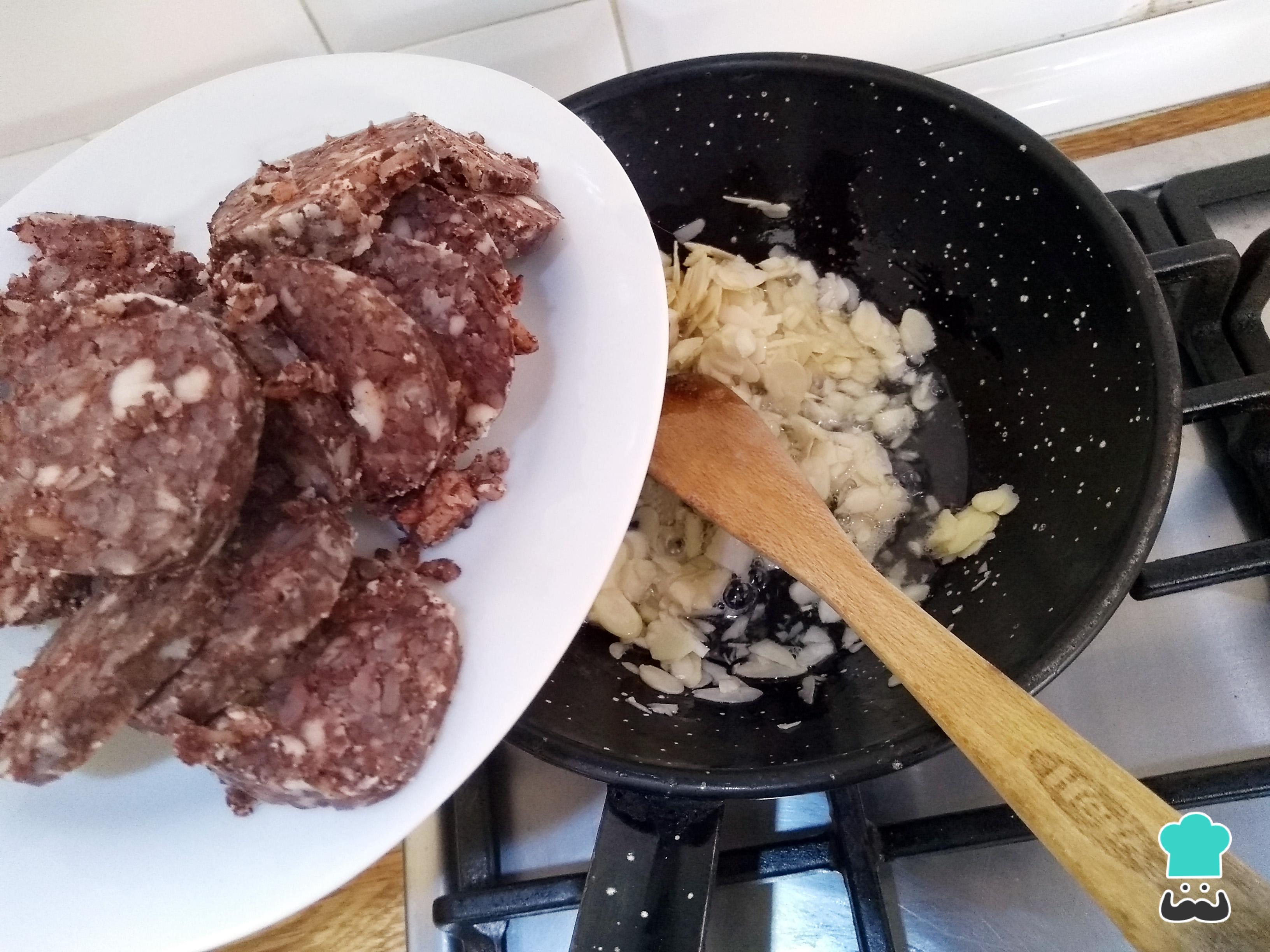 Pela y corta a rodajas la morcilla de arroz. Solo debes hacerle un corte trasversal a la pieza de morcilla y la tira de tripa saldrá fácilmente.Añade al sofrito y rehoga un par de minutos.
