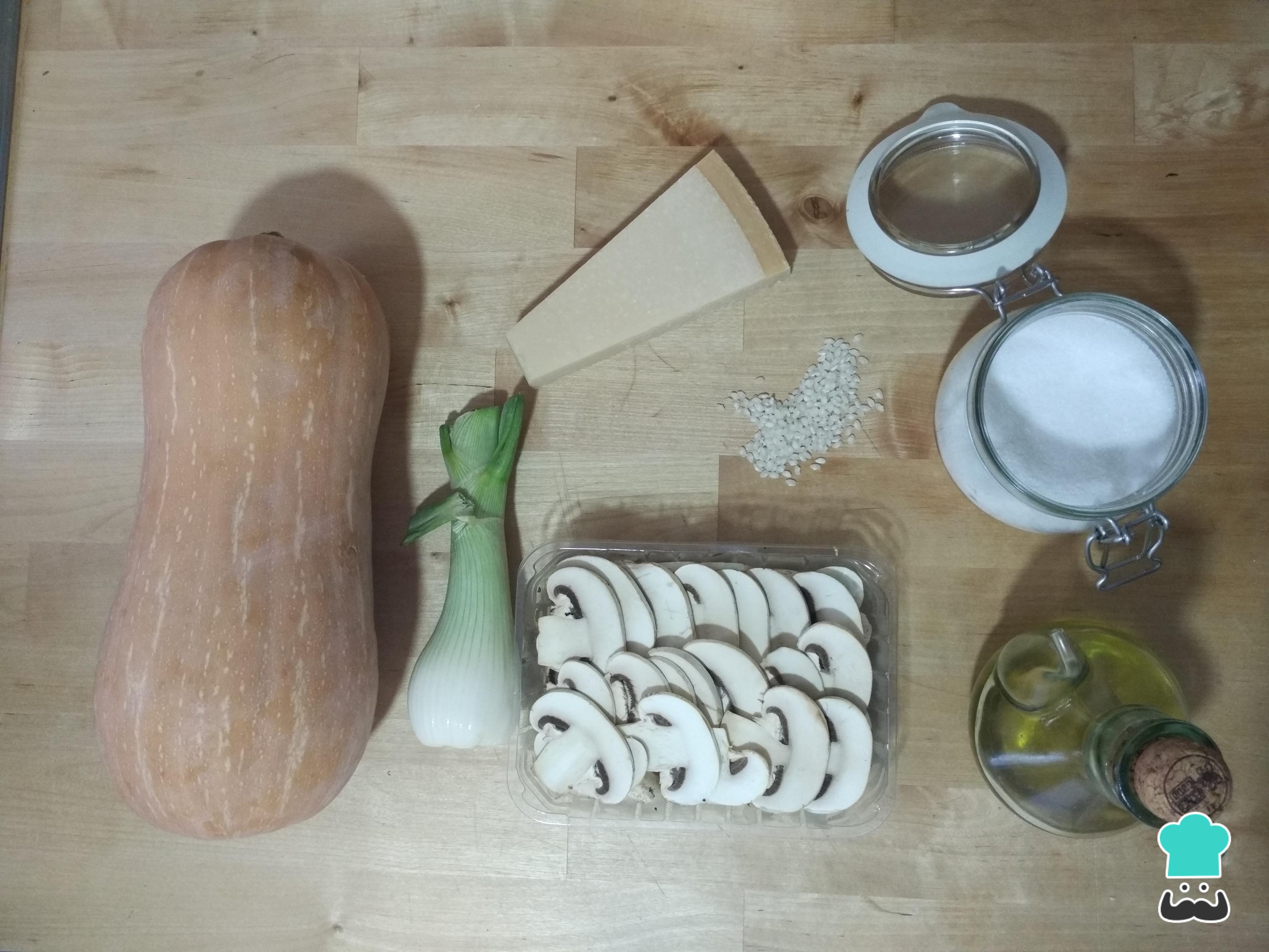 Reunimos todos los ingredientes para elaborar el risotto de calabaza y champiñones.