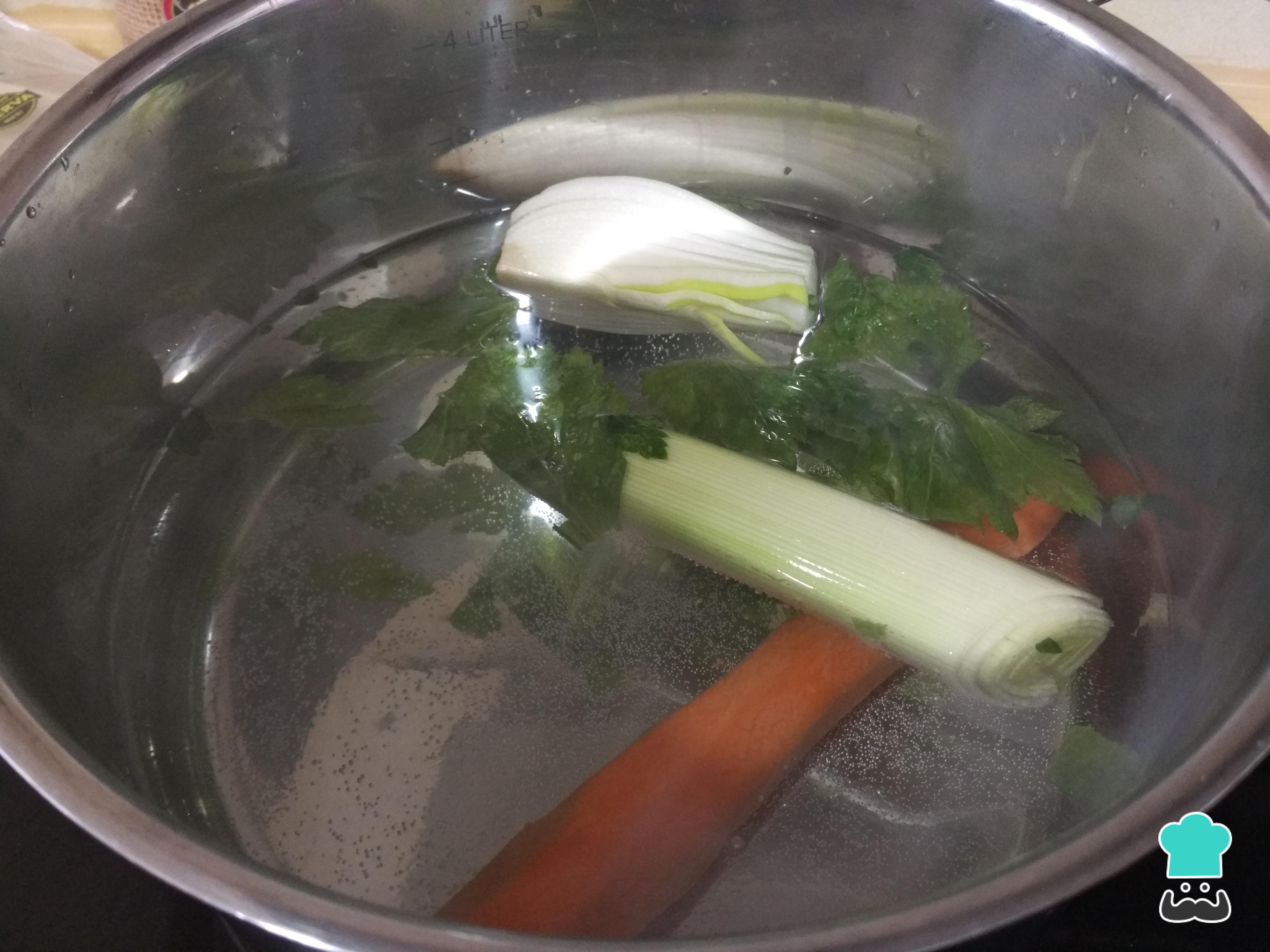 Si no tienes caldo de verduras, puedes preparar uno mientras elaborados el resto de la receta. Para ello, pon a hervir unas verduras en abundante agua. Puedes incluir cebolla, puerro, apio y zanahoria. Deja hervir durante media hora y pon un poco de sal.