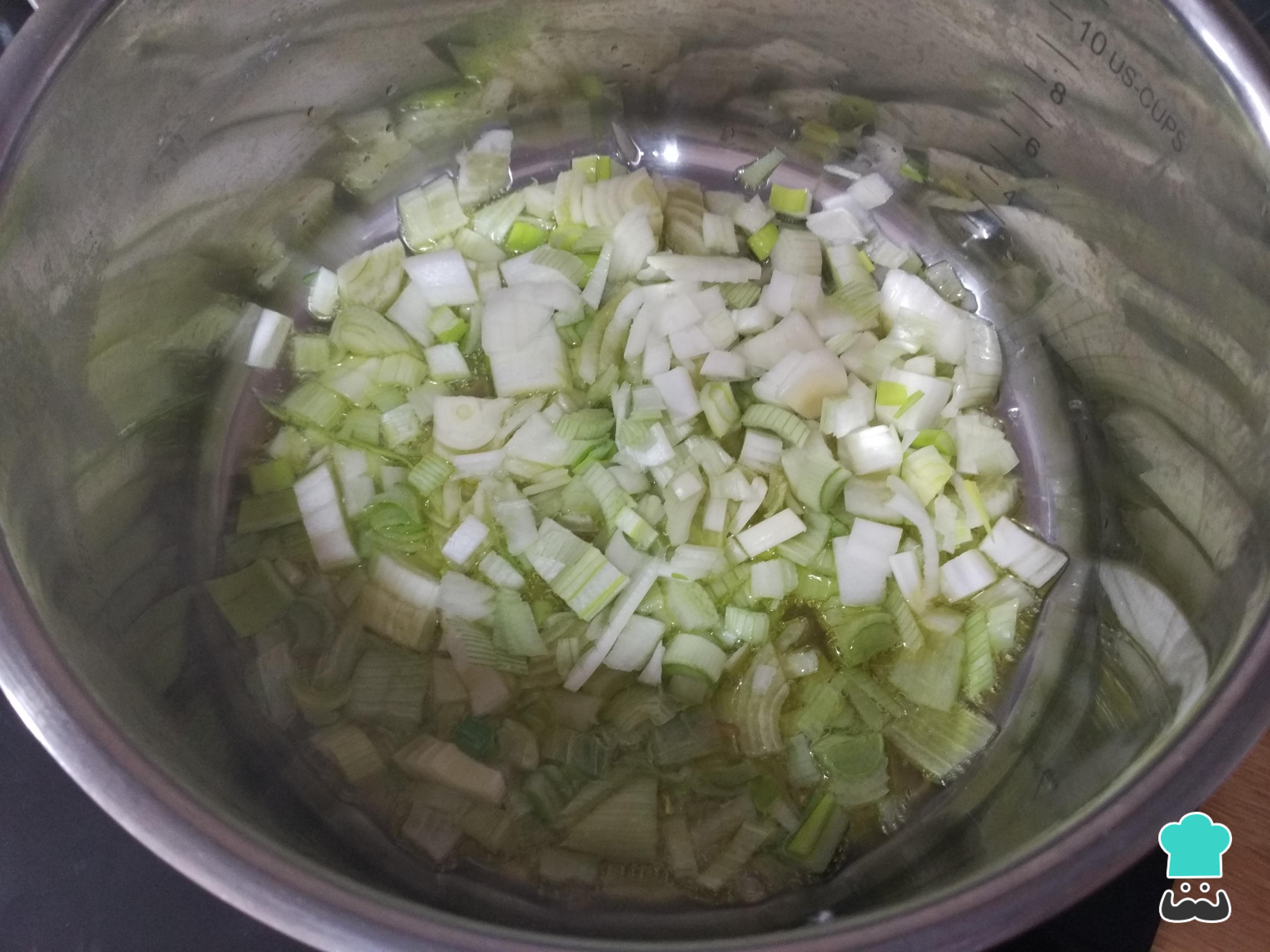Mientras se hace el caldo de verduras, hamos un sofrito con la cebolleta picada y un poco de aceite de oliva. Dejamos que se cocine durante 4 minutos.