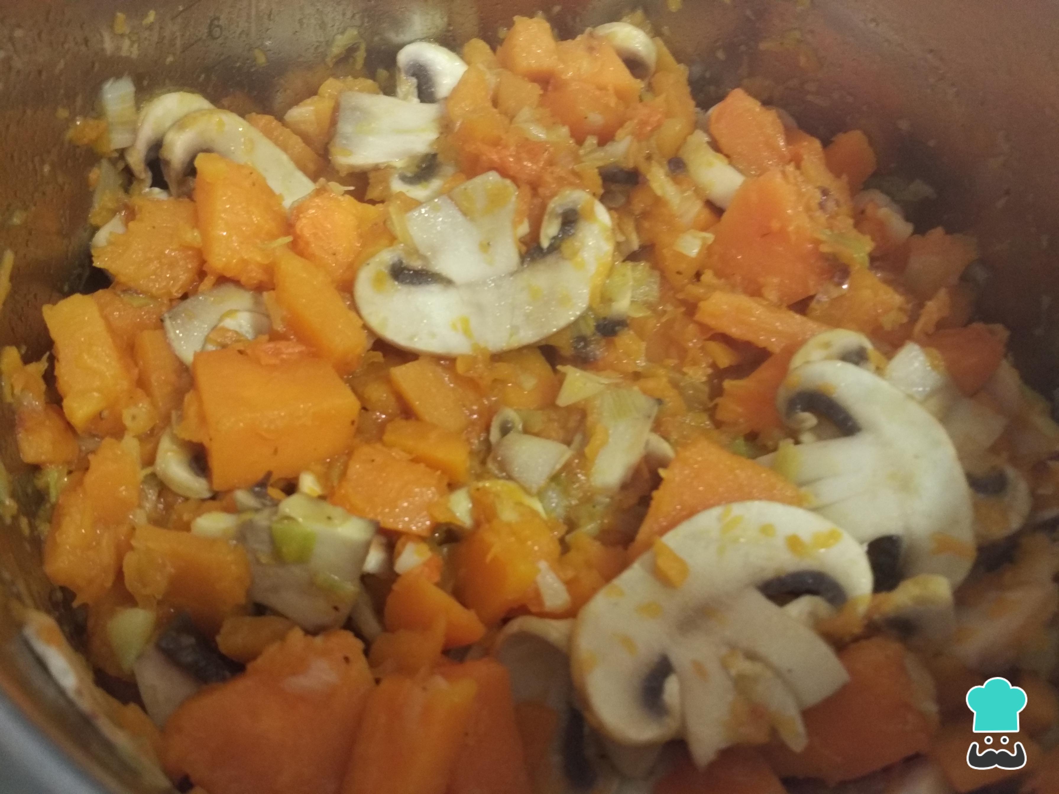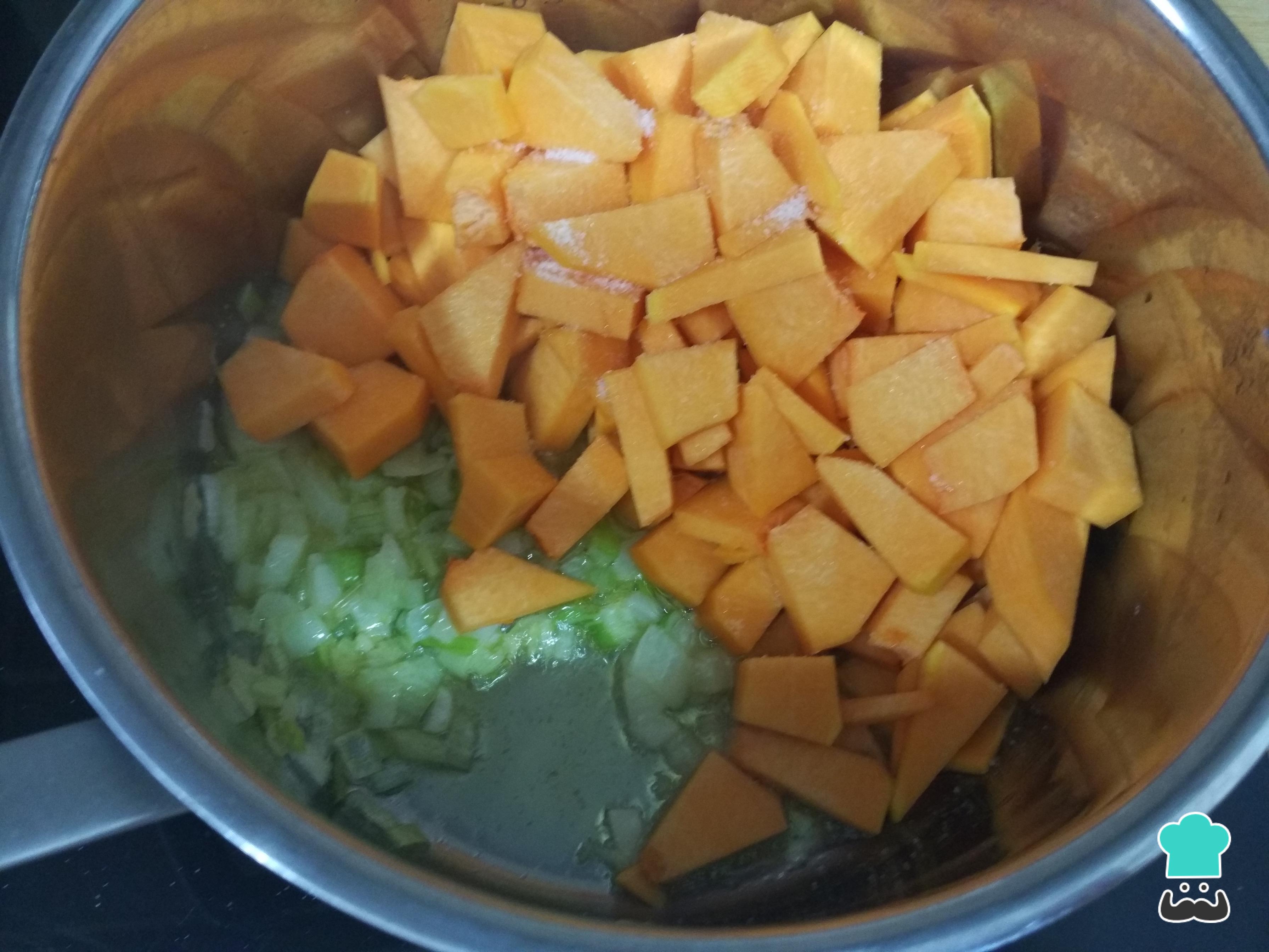 Agregamos la calabaza pelada y cortada en cuadraditos. Cuanto más pequeña la cortes antes se cocinará. Ponemos un poco de sal y pimiento negra molida y dejamos cocinar hasta que comience a ablandarse un poco, unos 20 minutos.
