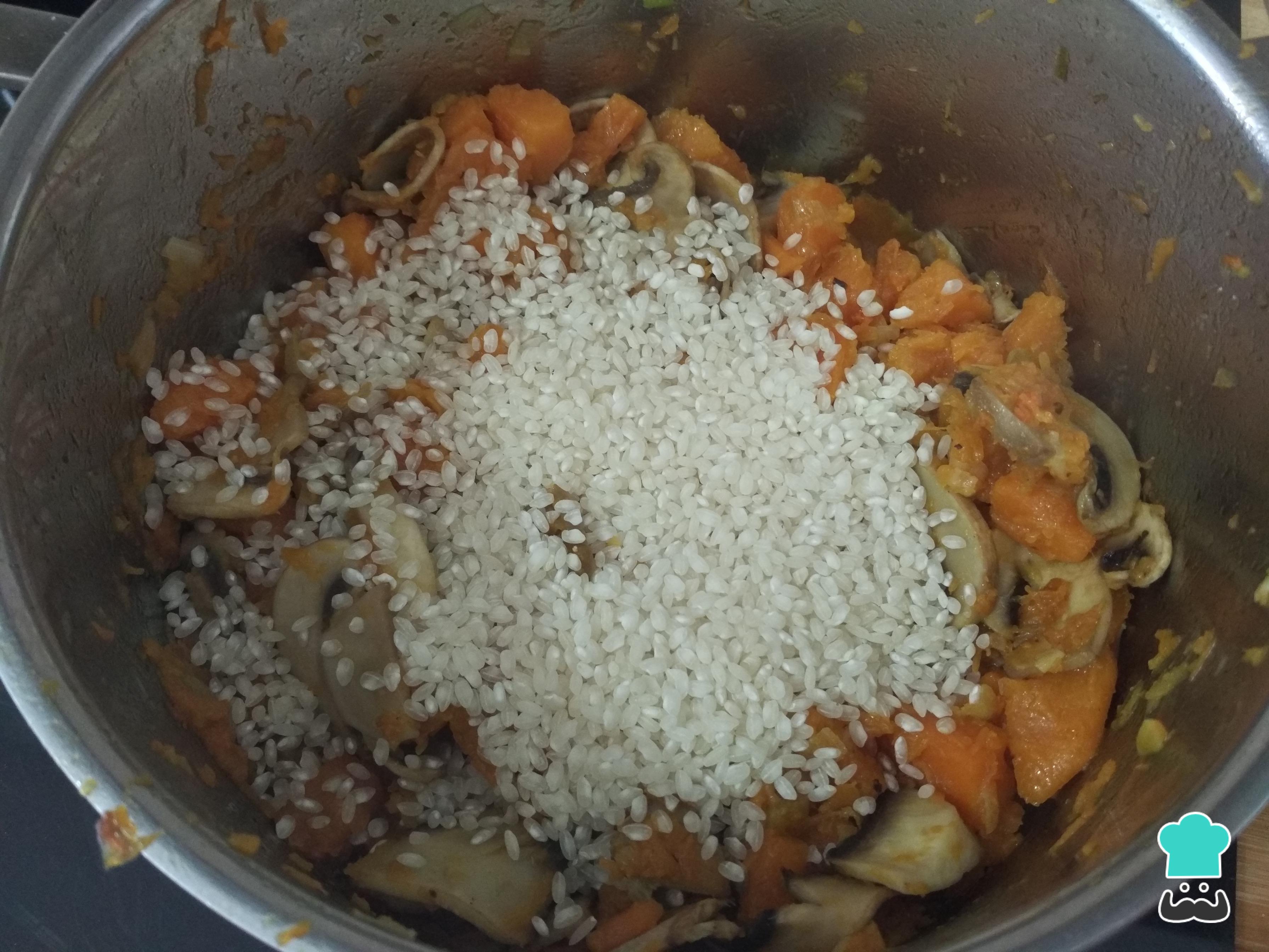 Echamos el arroz, rehogamos mezclando bien con el resto de ingredientes y cubrimos con el caldo de verduras. Vamos moviendo el risotto de calabaza y champiñones poco a poco y dejamos que reduzca el agua.
