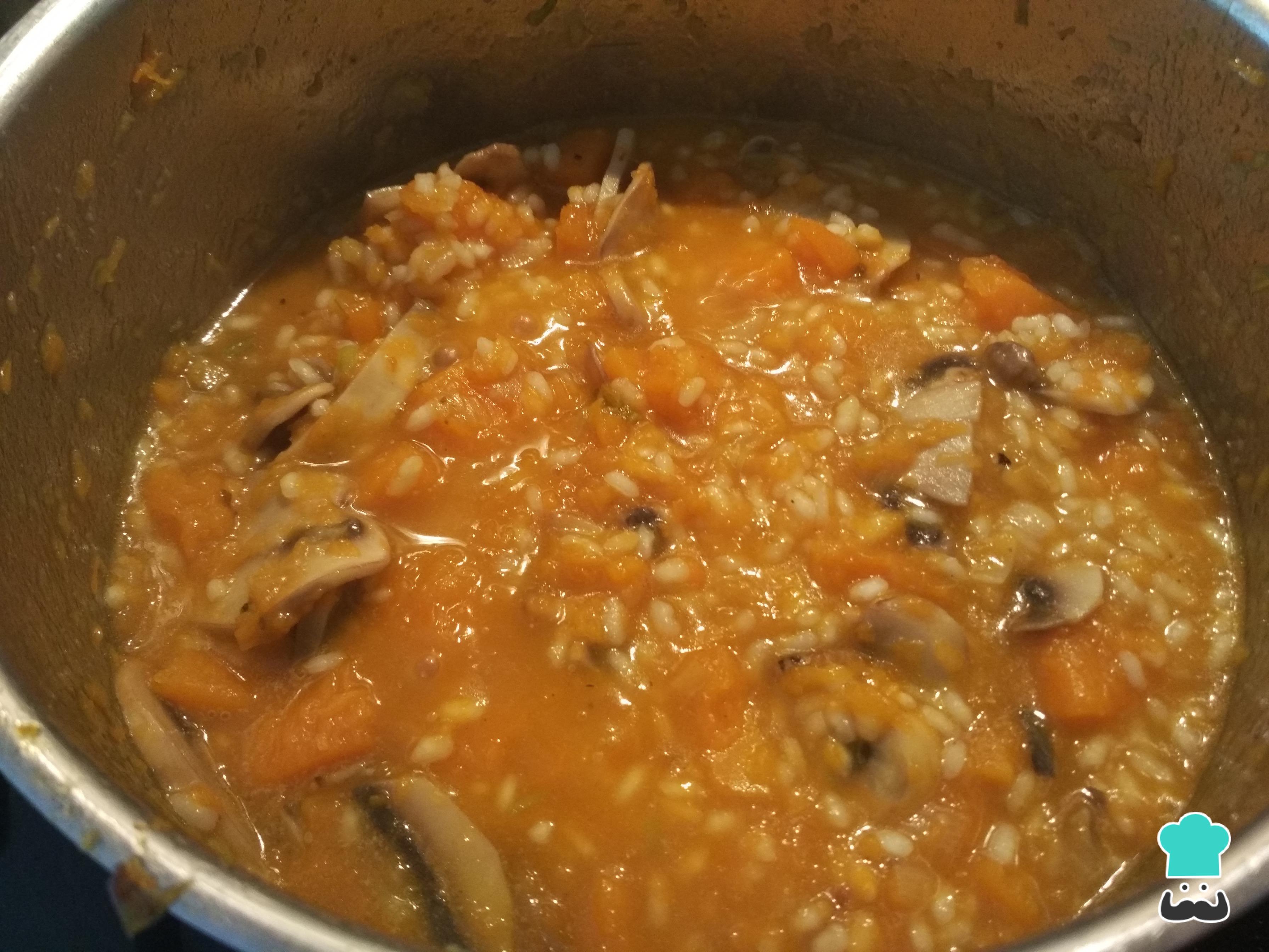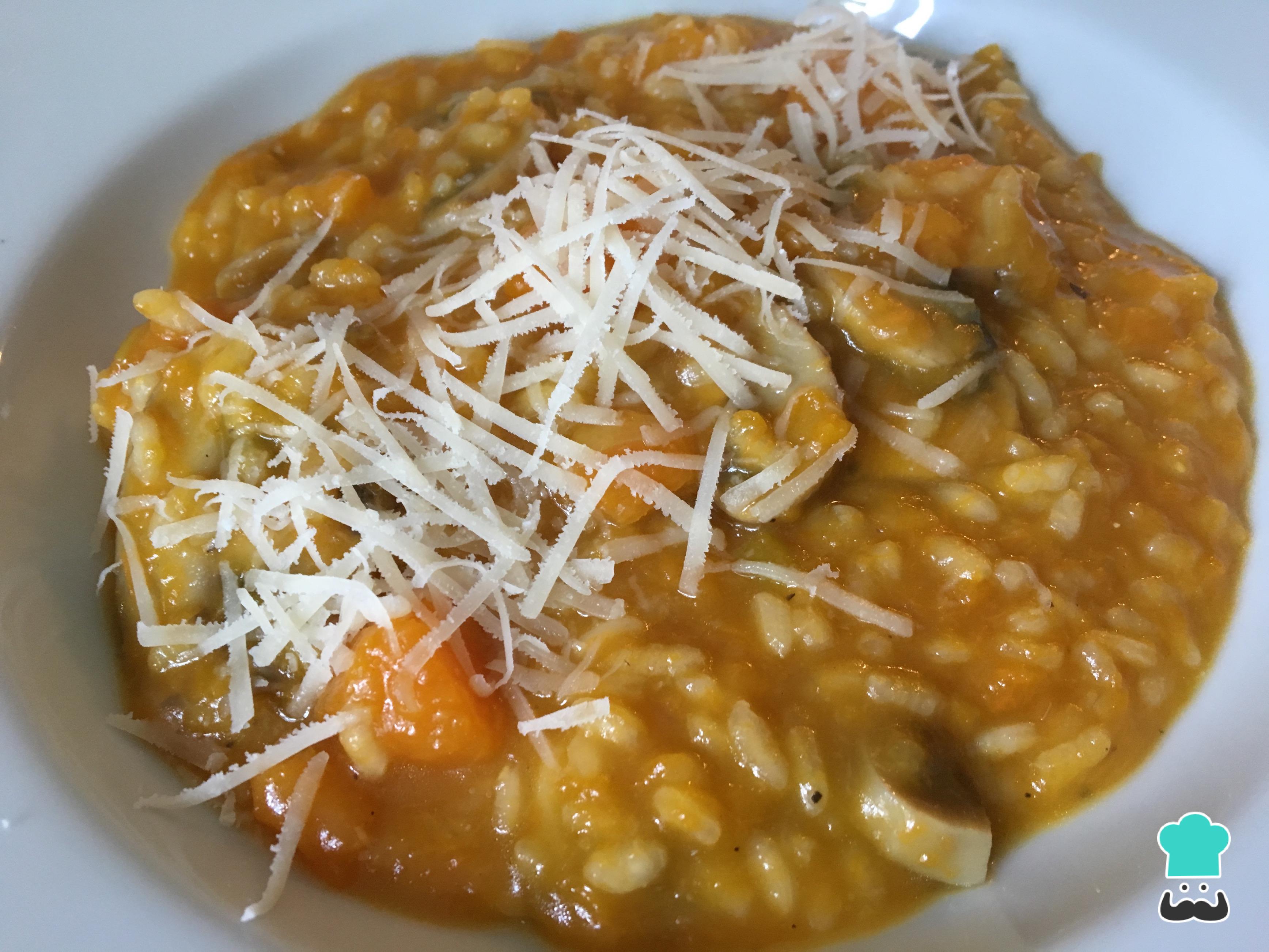 El risotto es una técnica culinaria italiana que tiene su origen en el noroeste del país, concretamente en el Piamonte, donde tradicionalmente había abundancia de arroz. Cuando se cocina el risotto, el arroz cuece poco a poco con el resto de ingredientes del plato, no por separado. Verás como en este risotto de calabaza y champiñones uno de los distintivos es el queso parmesano, fundamental en cualquier variedad de risotto.