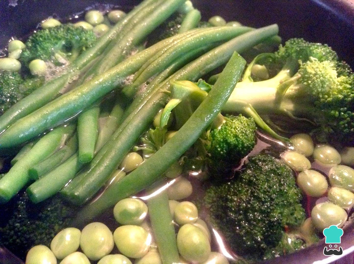 Lleva una olla honda con suficiente agua a fuego medio. Cuando esté hirviendo añade las judías verdes, el brócoli y las arvejas. Cocina estos vegetales hasta que estén al dente y retíralos del agua.