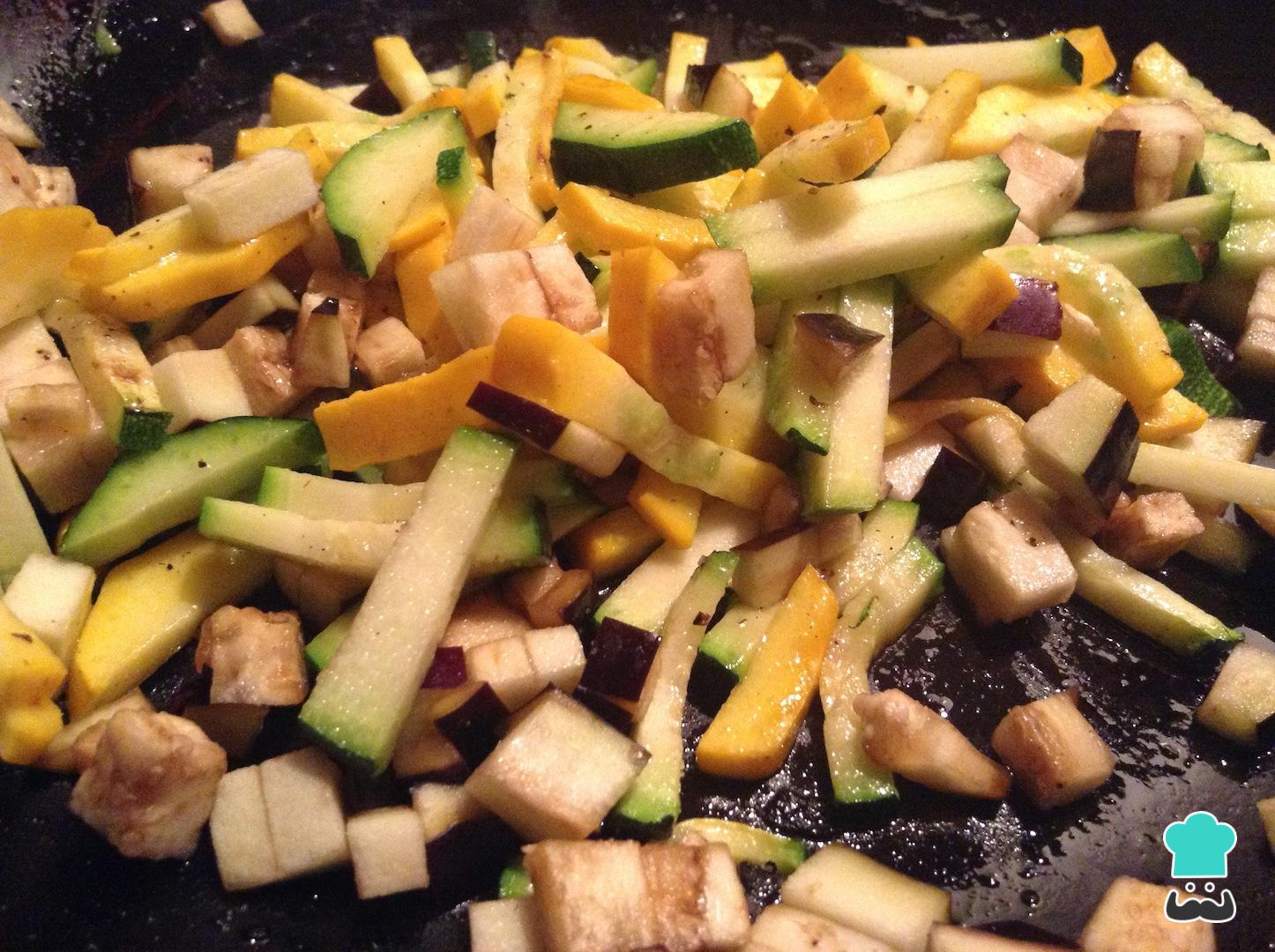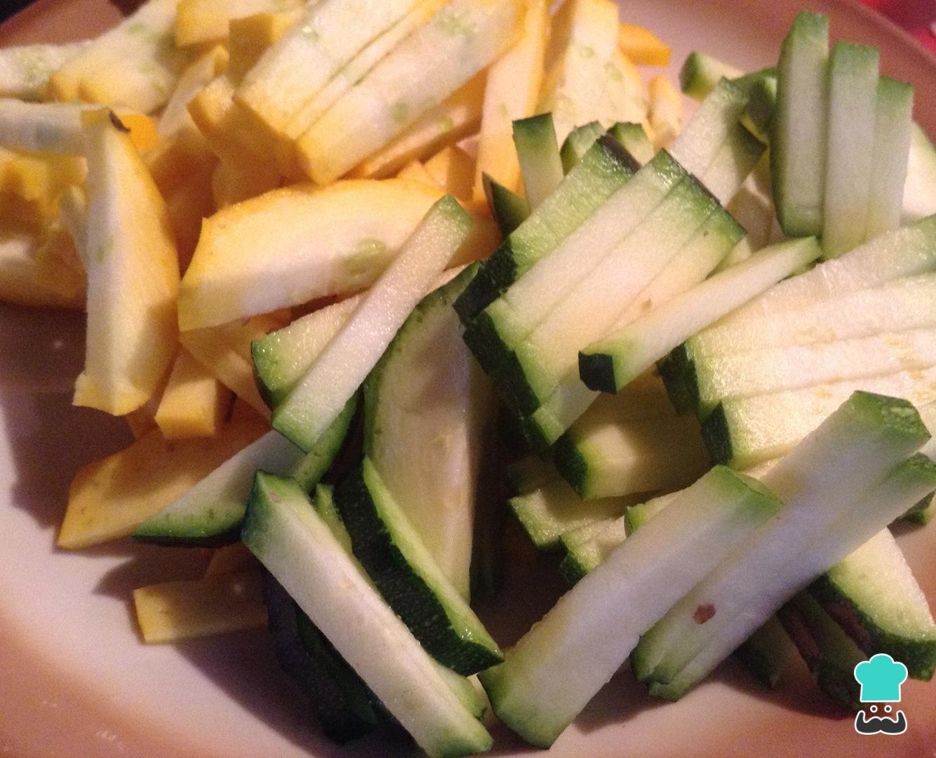 Lava los calabacines o zucchinis y córtalos en tiras medianas. La berenjena vamos a cortarla en cuadros medianos y a reservarla.