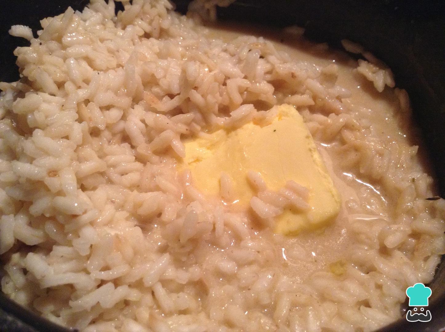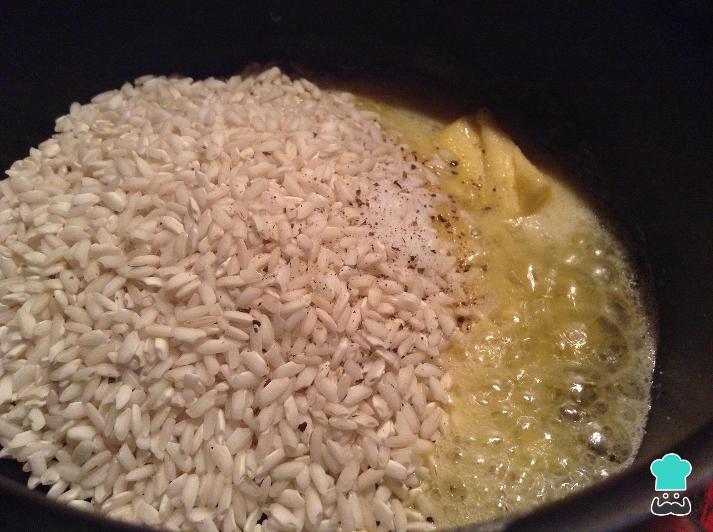 Lleva una olla honda a fuego medio con una cucharada de mantequilla y una cucharada aceite de oliva, agrega el arroz y saltea durante algunos minutos. Verás que el arroz se irá blanqueando.