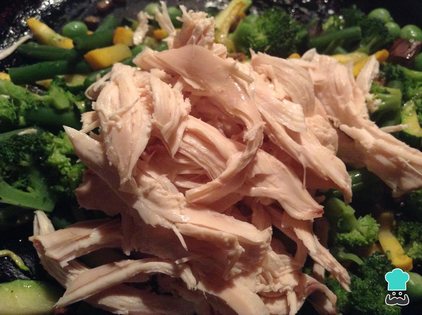Añade la pechuga de pollo desmenuzada a la sartén donde tienes las verduras salteadas y listas para mezclar con el resto de la receta.
