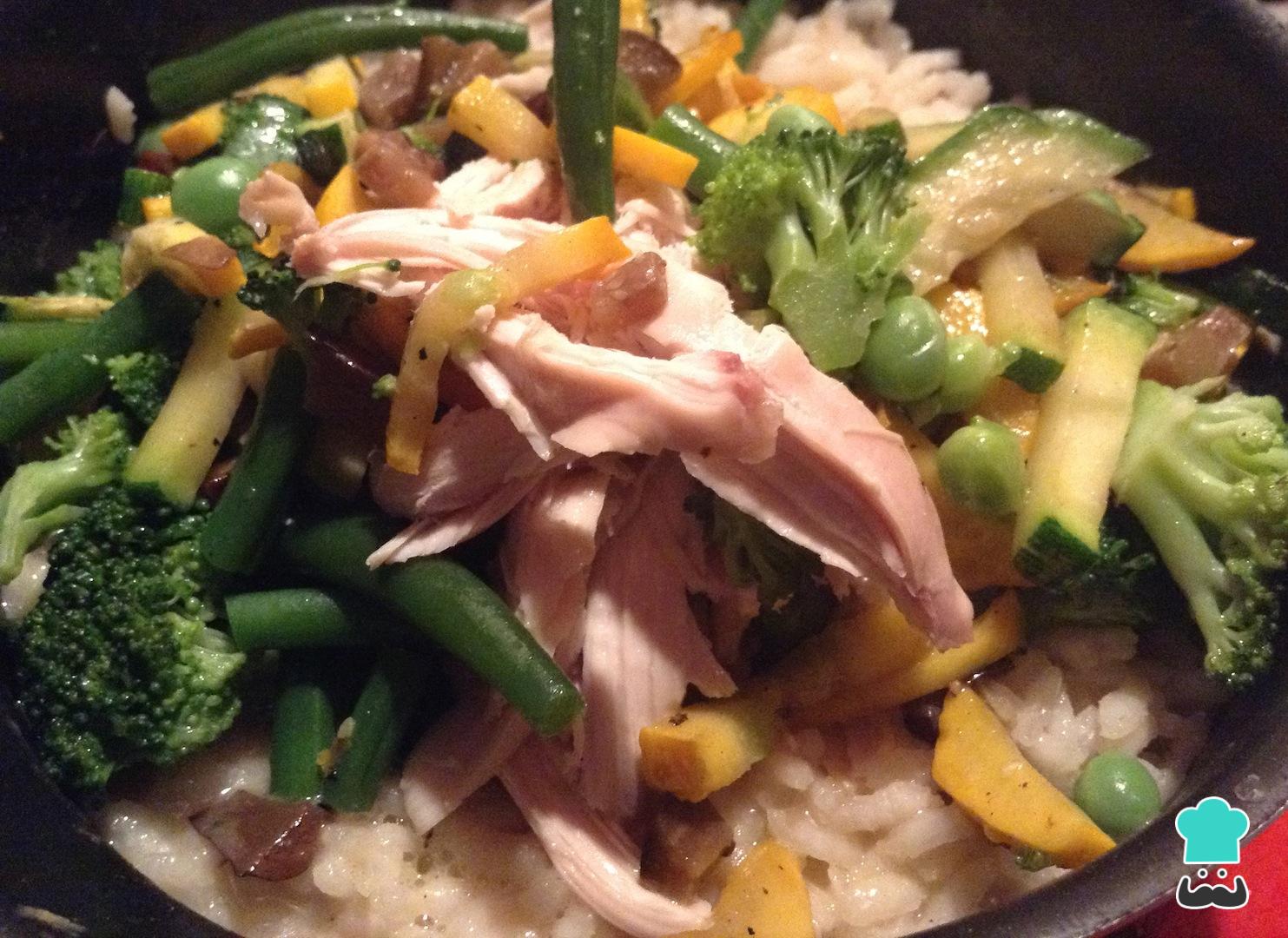 Mezcla las verduras, el pollo y risotto. Lo ideal es que mezclemos bien todos los ingredientes y queden bien distribuidos por toda la preparación.