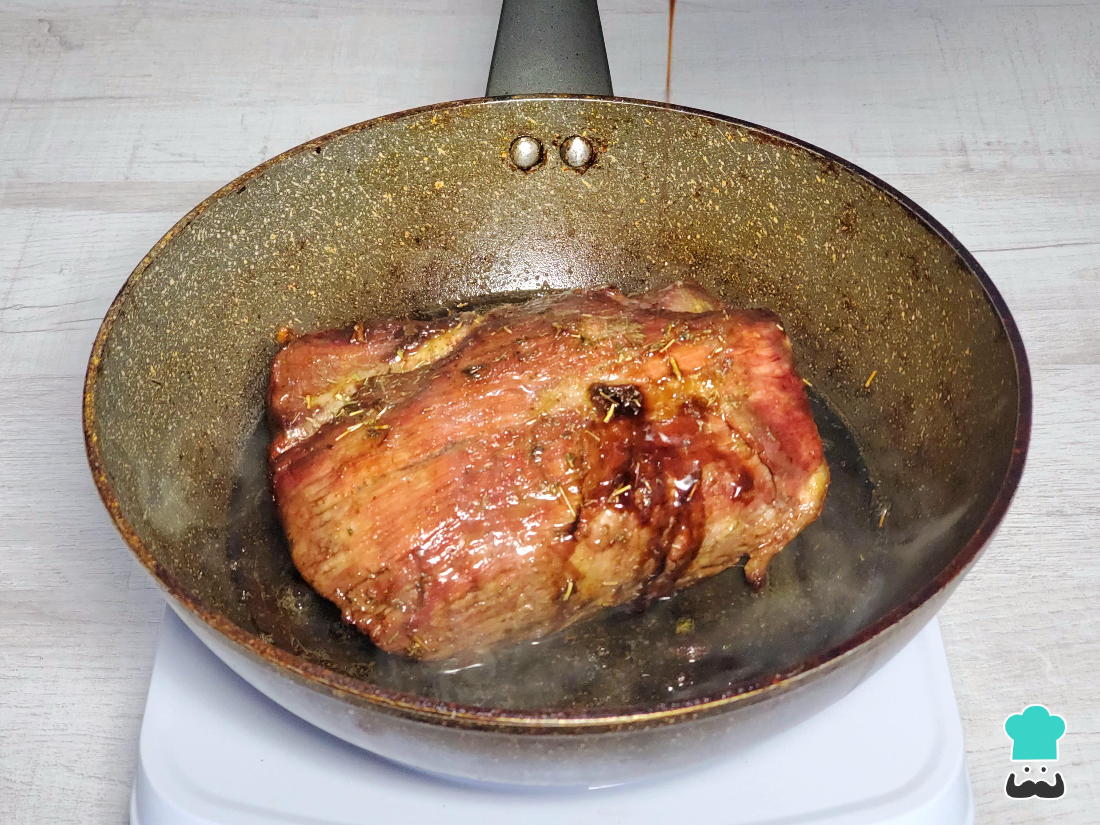 Aromatiza con tomillo, romero y ajo en polvo, o mejor aún, con dientes de ajo frescos. Vierte vino tinto o cerveza y deja que el alcohol se evapore, girando la pieza para que se impregne bien de los aromas.