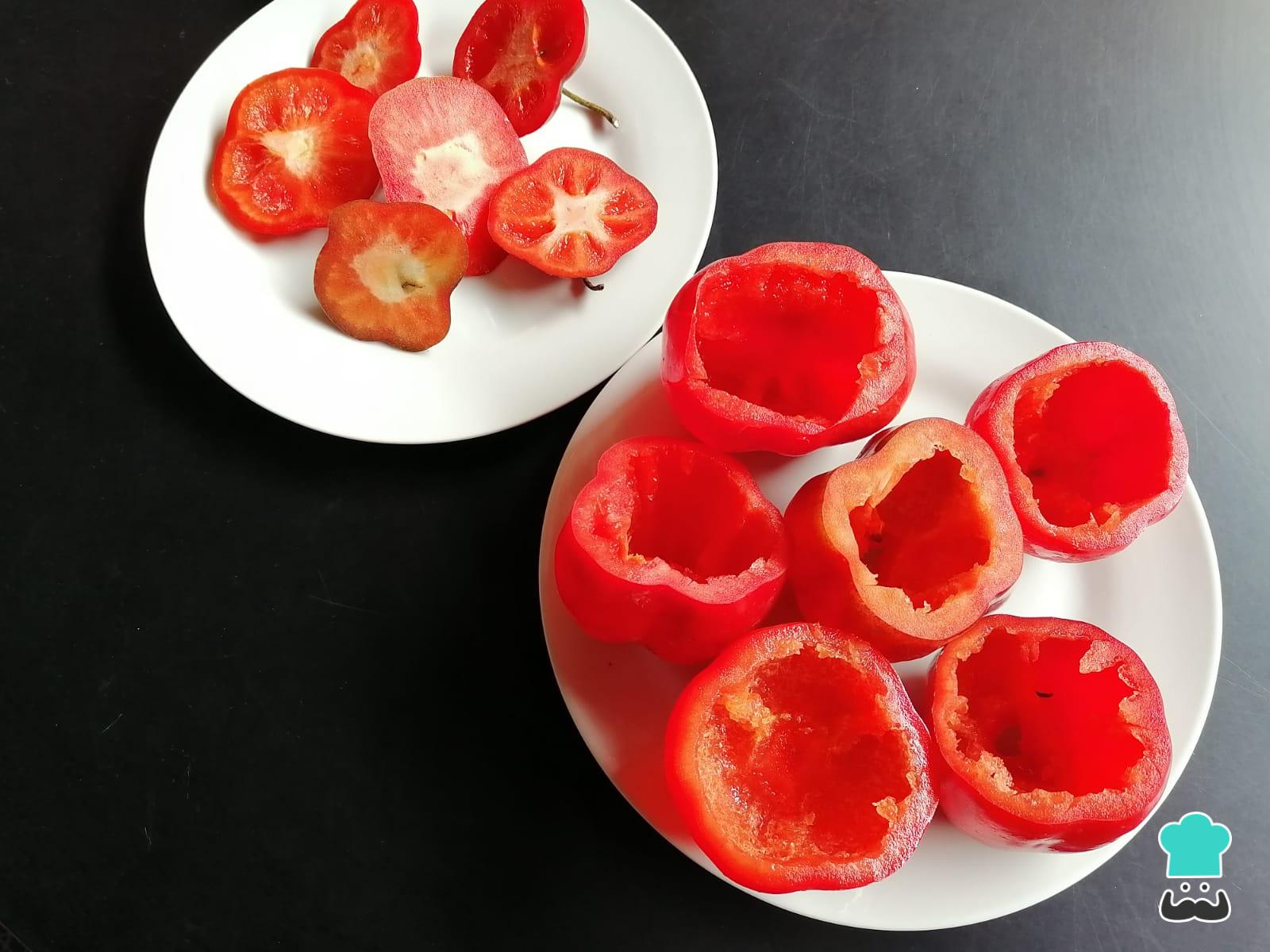 En primer lugar, limpia los rocotos con mucho cuidado, ya que pueden causar picor o ardor en las manos. Córtalos por la parte superior y reserva. También, limpia el interior retirando las pepitas.