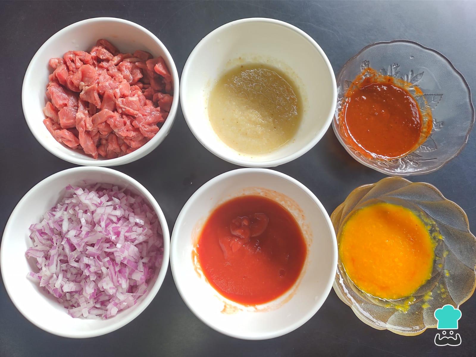 Prepara los ingredientes del rocoto relleno: la carne de res molida, la cebolla picada para el aderezo, el ajo molido, las pastas de ají amarillo y ají panca y también la pasta de tomate.
