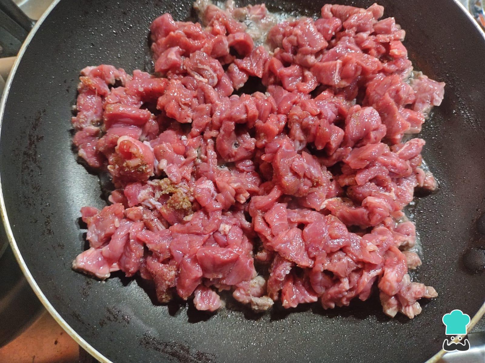 Calienta una sartén con un chorro de aceite y comienza a sellar la carne de res. Sazona con sal y pimienta al gusto.