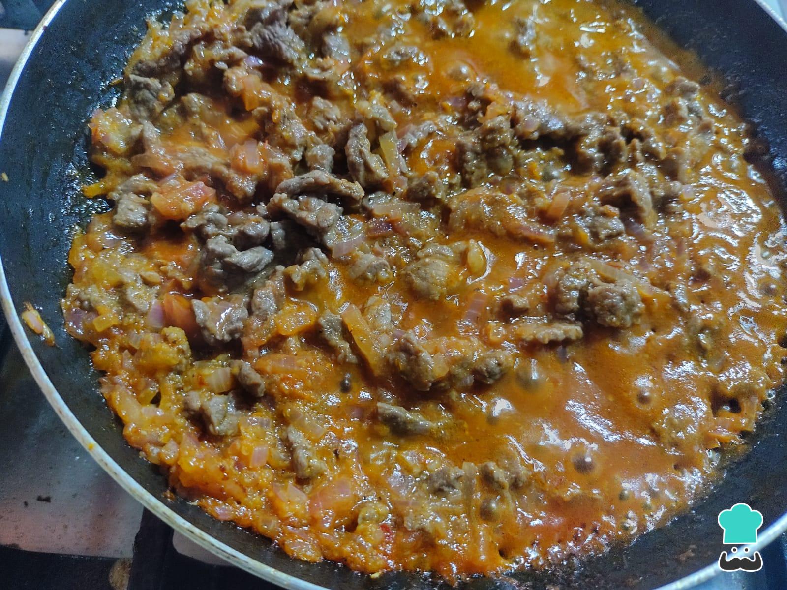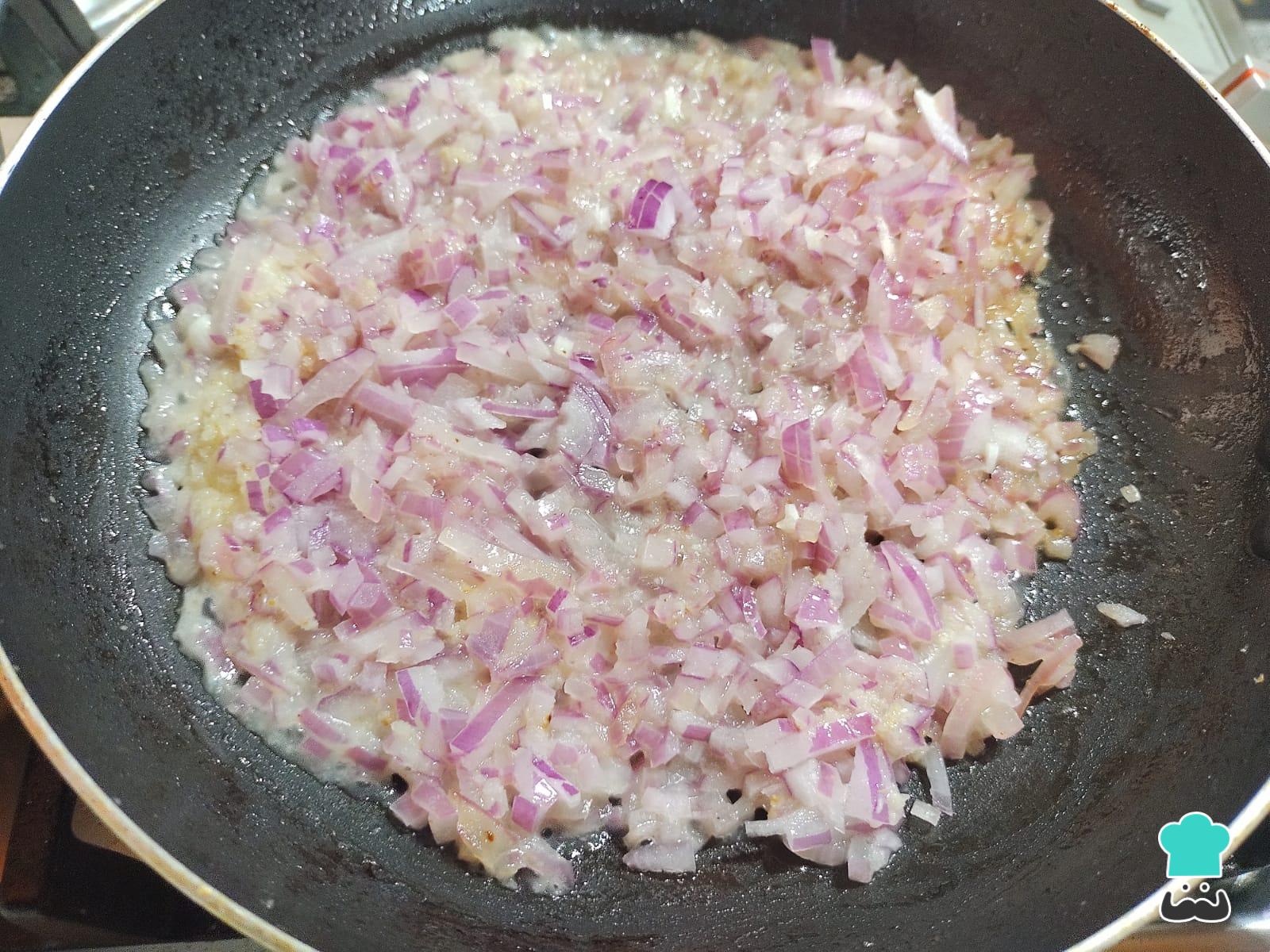 Una vez cocinada la carne, retírala del fuego y reserva. En la misma sartén, sofríe la cebolla roja junto con el ajo molido.