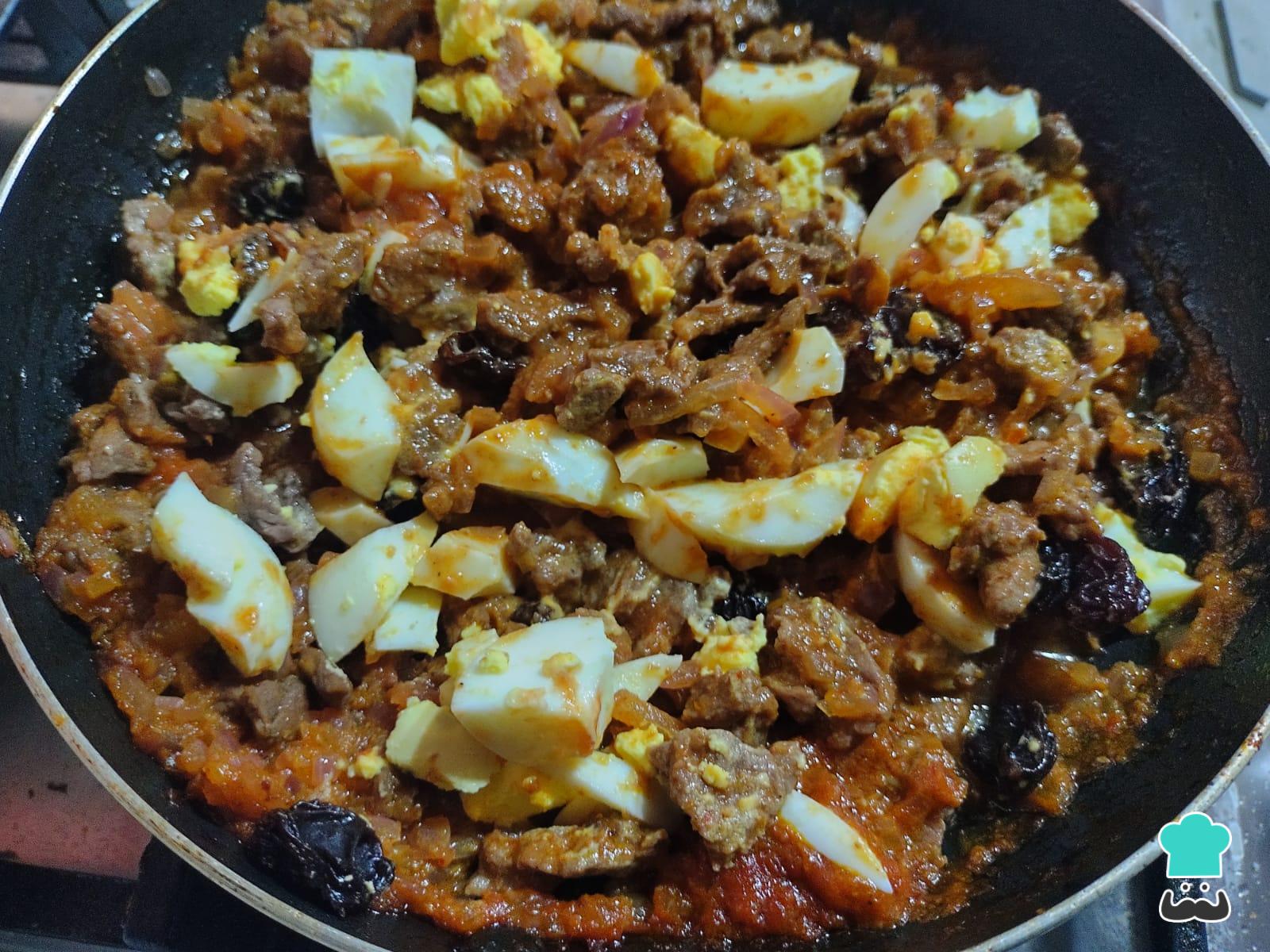 Para finalizar con el relleno, agrega las pasas y los huevos sancochados en trocitos pequeños. Prueba, rectifica de sal y reserva.