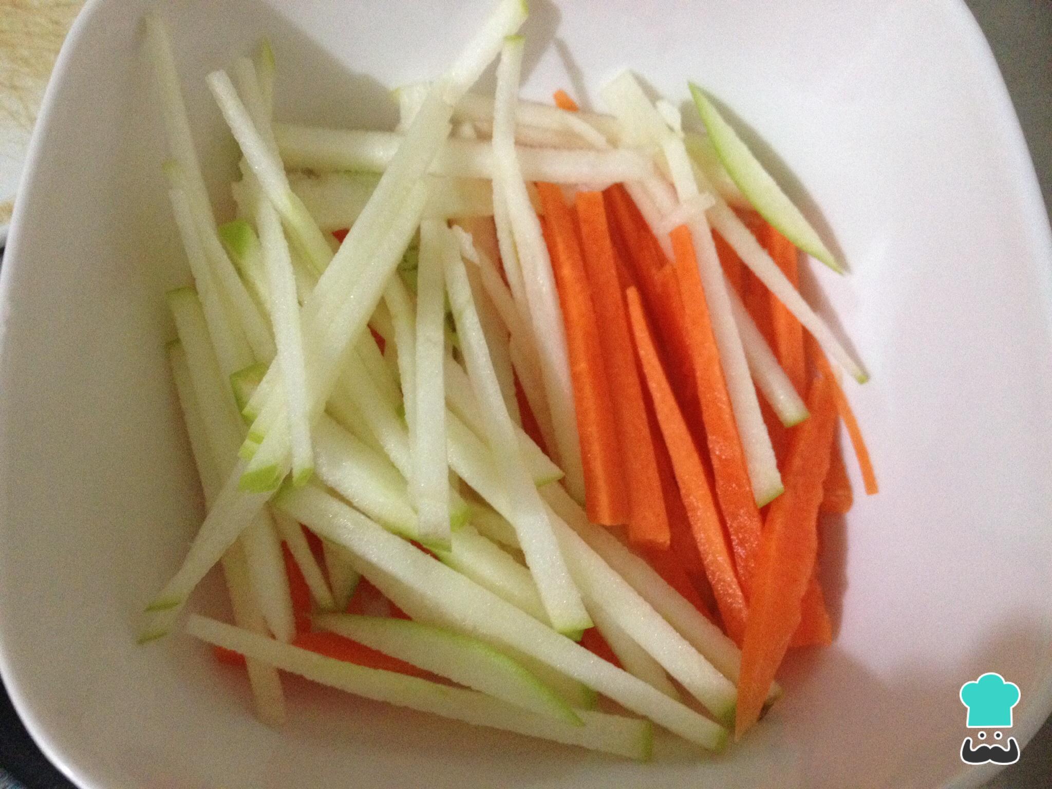 Corta la zanahoria y la manzana en julianas delgadas.