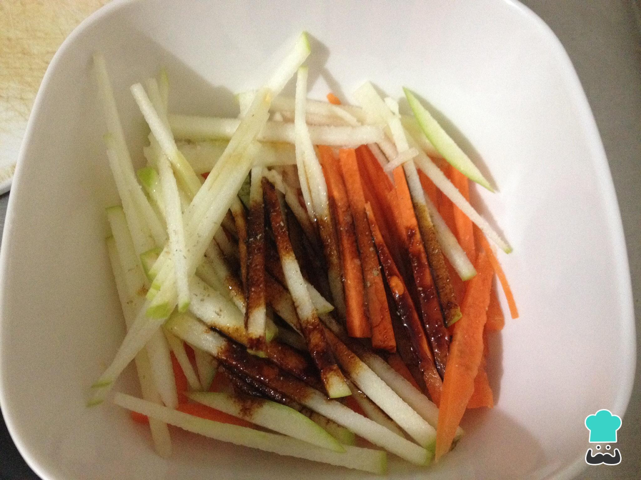 Agregar la salsa de soja, el aceite de ajonjolí, el zumo de limón, sal y pimienta. Dejar macerando la manzana y la zanahoria en esta "salsa" y reservar.