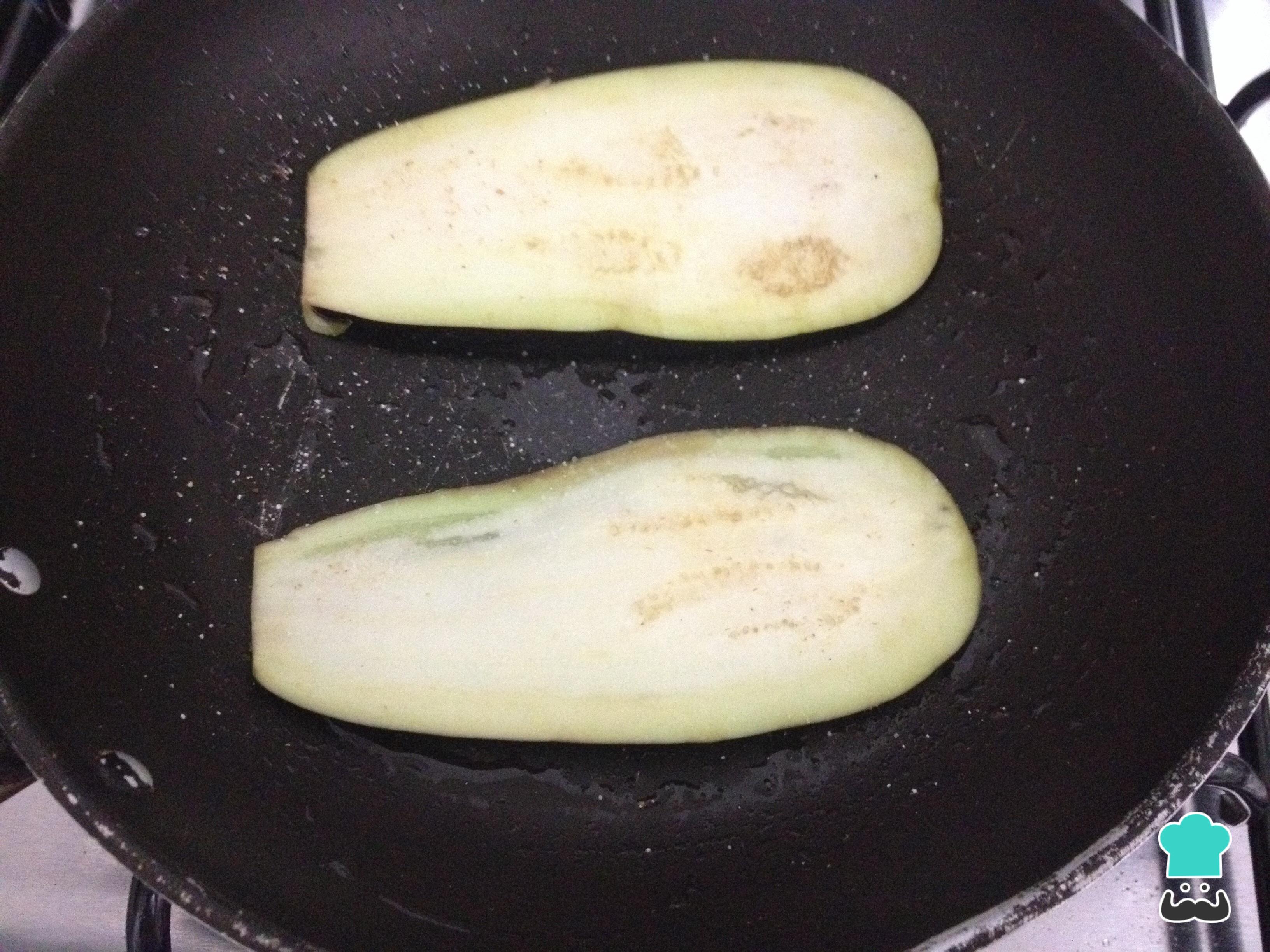 Cortar la berenjena en laminas y condimentar con sal, pimienta y ajo en polvo. Añadir un poco de aceite de girasol en la sartén y cocinar por ambos lados a fuego medio.