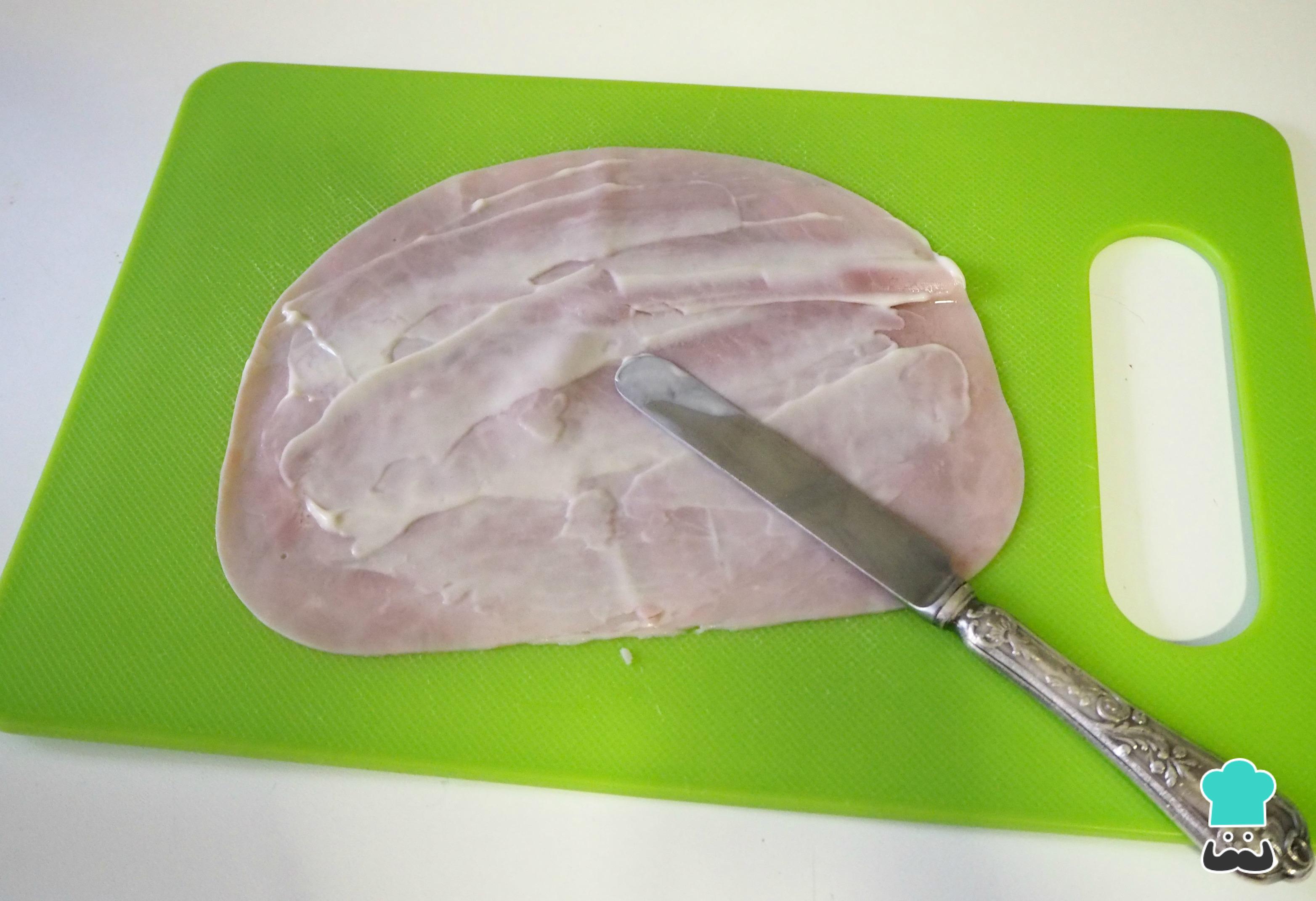 El primer paso para preparar estos delicioses y ligeros rollitos de jamón y espárragos es, sobre una loncha de jamón, poner un poco de mayonesa.