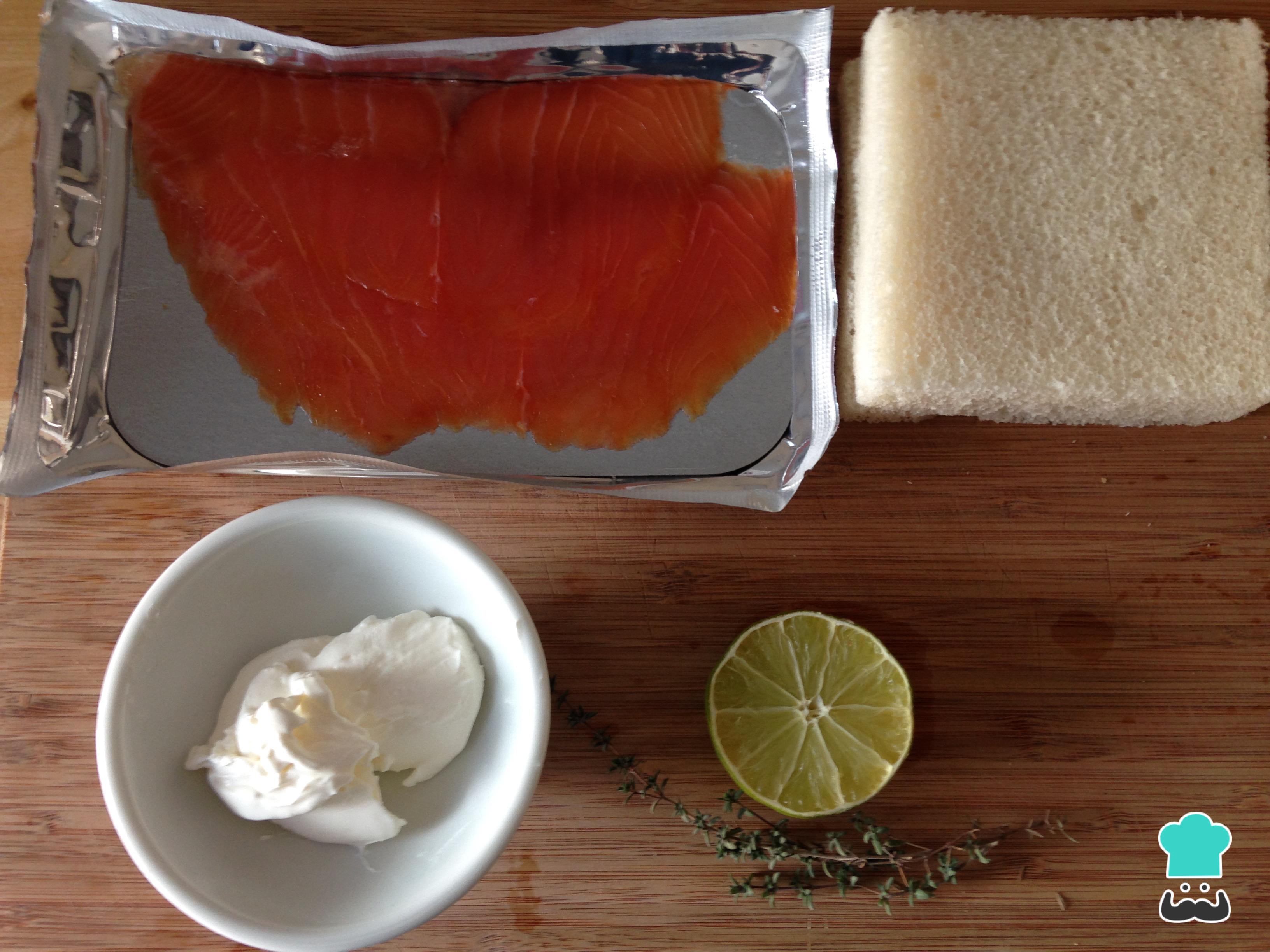 Para elaborar los rollitos de salmón ahumado con pan de molde, reunimos todos los ingredientes. Si quieres puedes seguir la receta de salmón ahumado para hacerlo de forma casera.