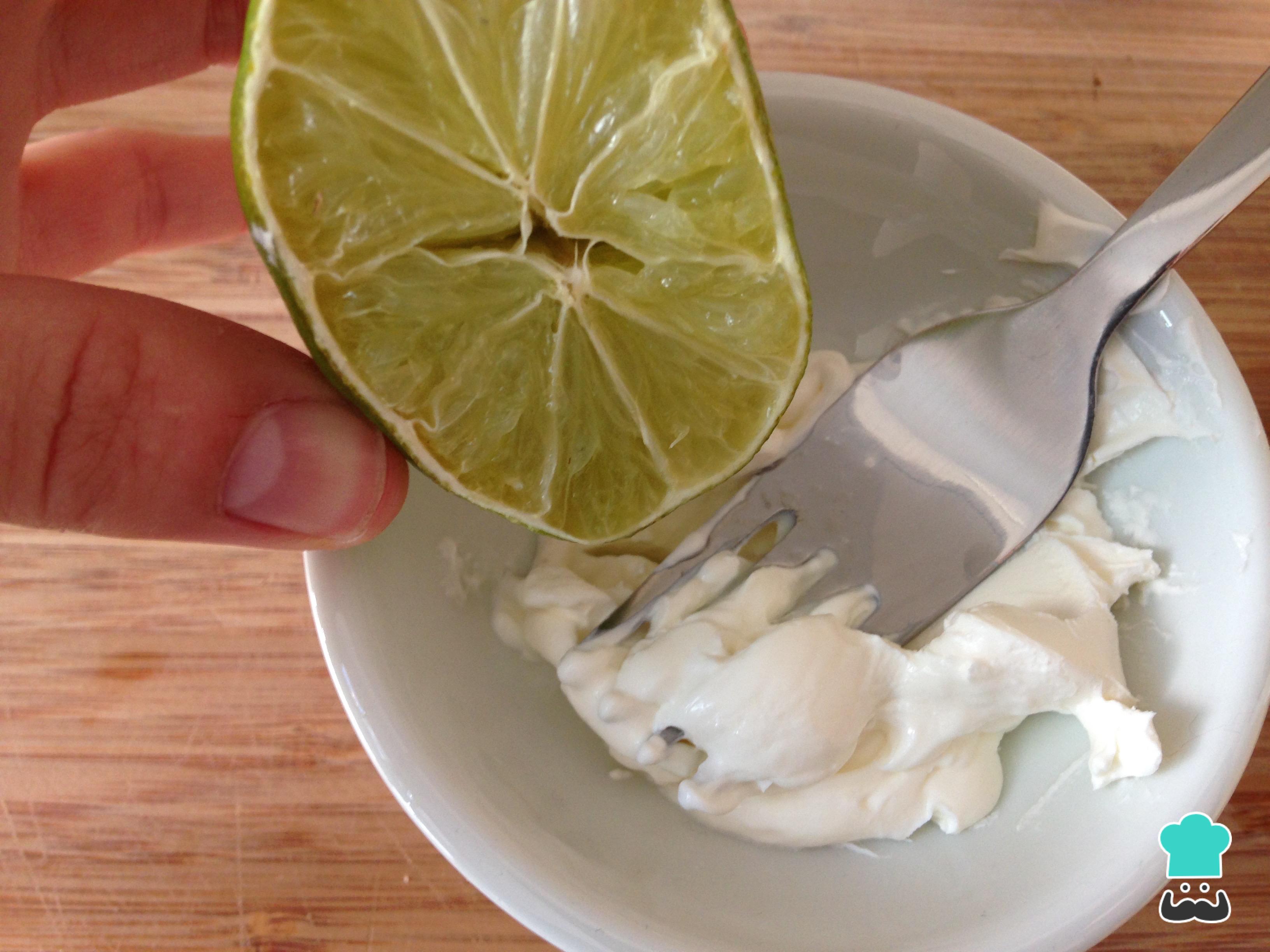 En un bol mezclamos el queso de untar con una cucharadita de zumo de lima. Movemos bien con un tenedor para que se integren los sabores.
