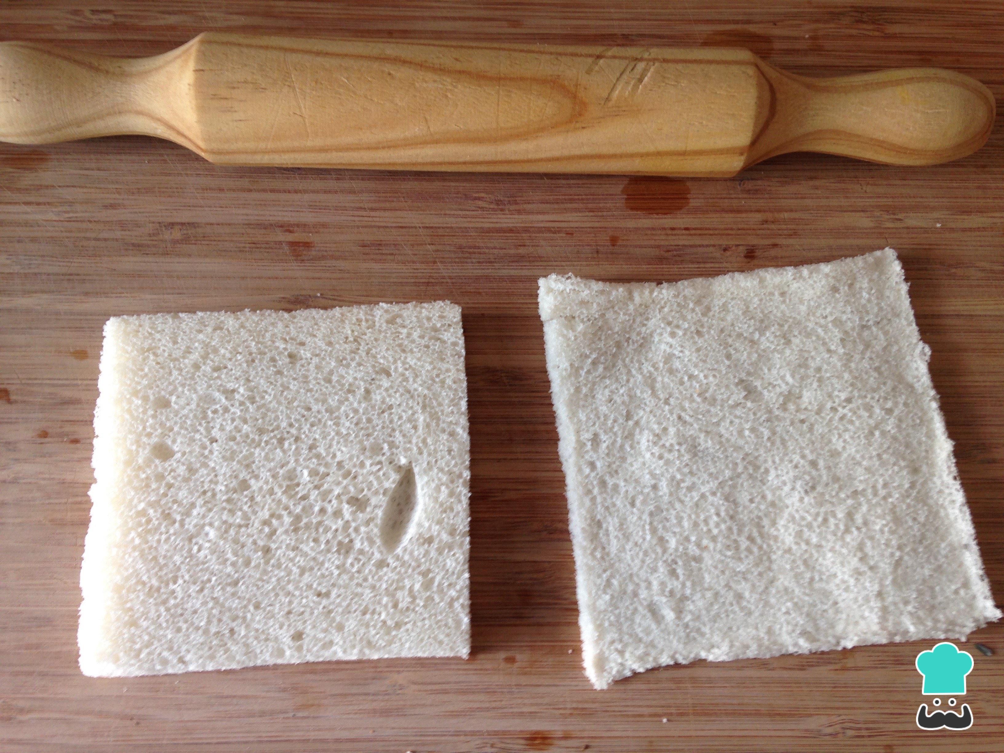 Con ayuda de un rodillo amasamos las rebanadas de pan de molde sin corteza hasta que queden finitas y planas.