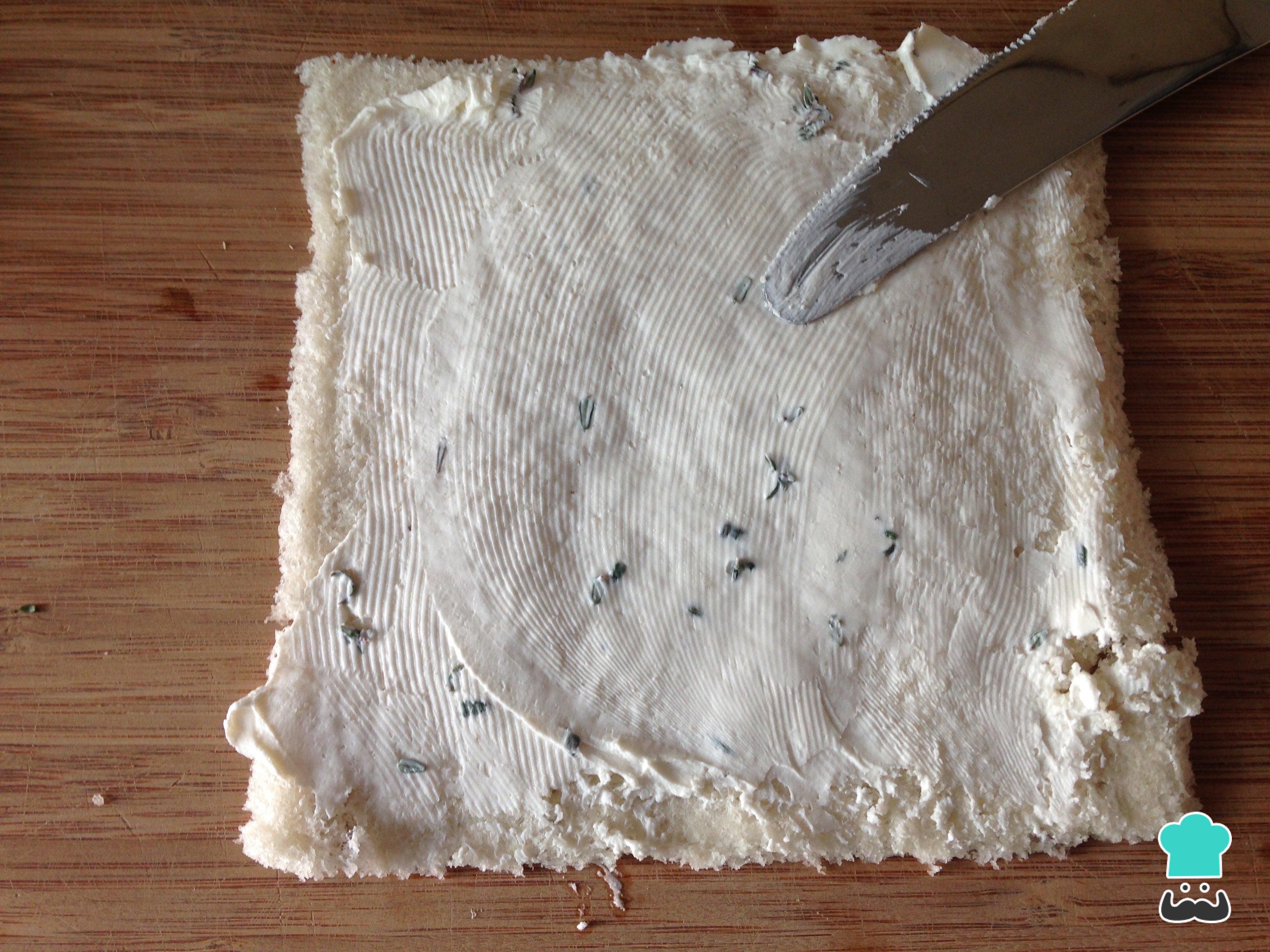 Untamos cada rebanada de pan con el queso crema que hemos preparado. Extendemos bien por todas partes.