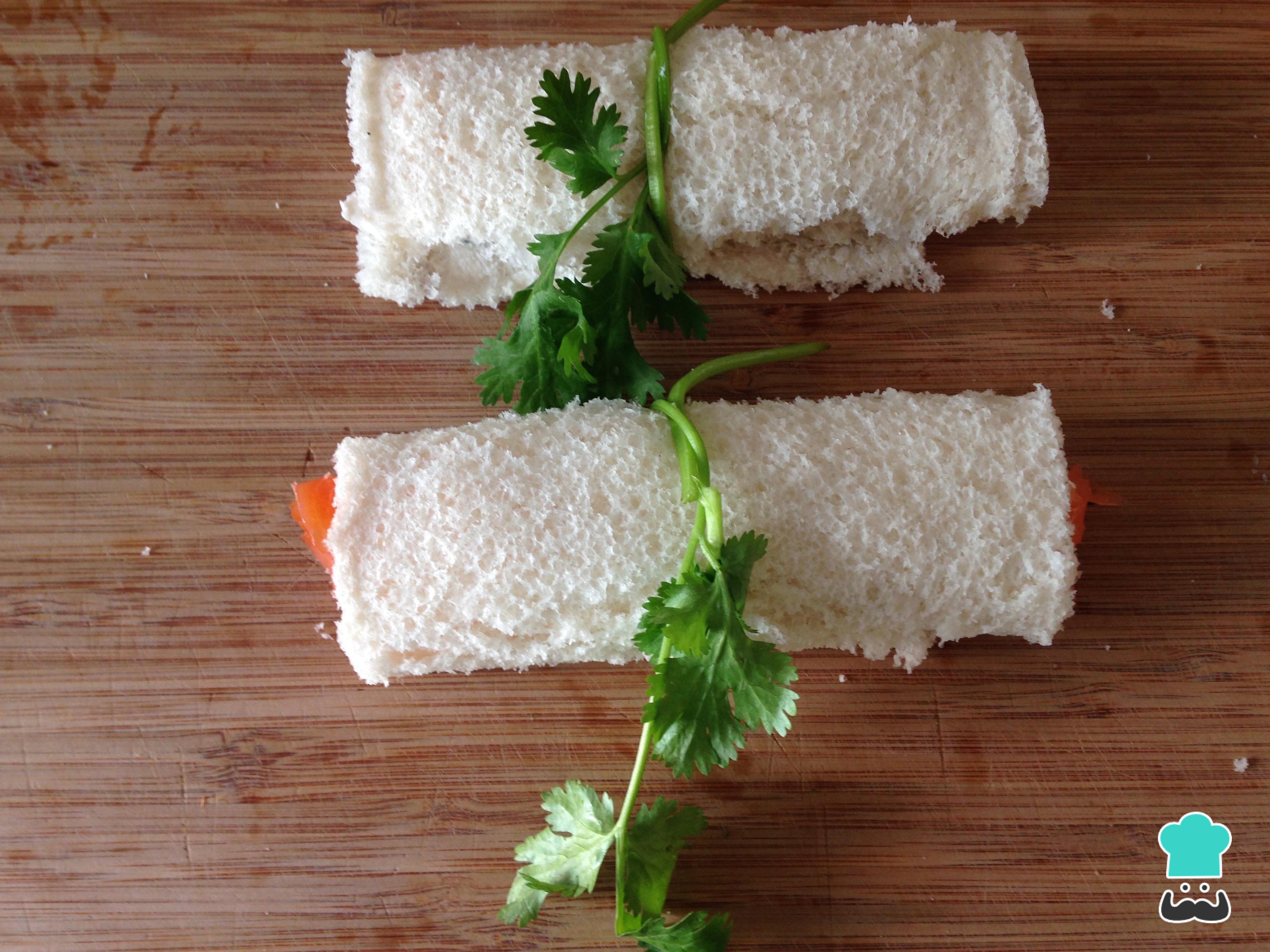 Enrollamos los rollitos de salmón ahumado con pan de molde. En este paso hemos de tener cuidado de que no se rompan. Si os apetece se pueden atar con un poco de cilantro, perejil o cebollino.