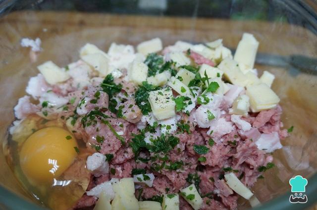 Cogemos un bol, pondremos la carne picada e iremos añadiendo todos los ingredientes y mezclando. Reservaremos 1 huevo.