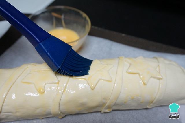 Batimos el huevo que tenemos reservado, cogemos con una brocha de cocina y pintamos todo el hojaldre.