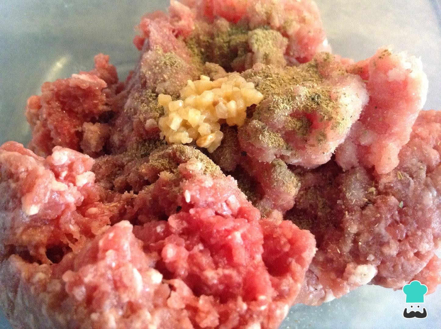 En un tazón o bol adiciona las carnes molidas con sal, pimienta y un poco de ajo. Mezcla bien los ingredientes.