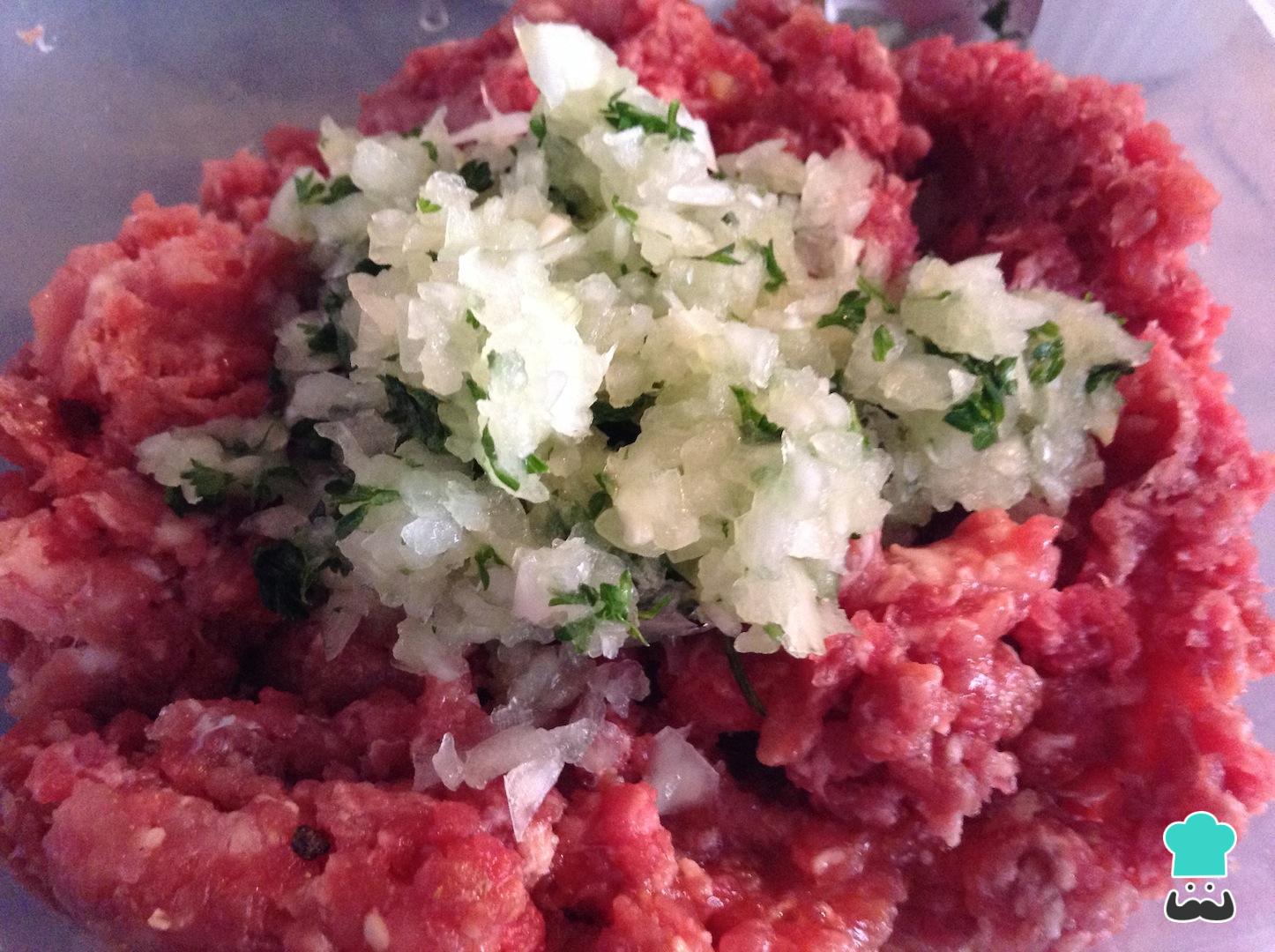 Agrega la cebolla procesada y el perejil finamente picado. Mezcla bien los ingredientes para seguir elaborando el pastel de carne.