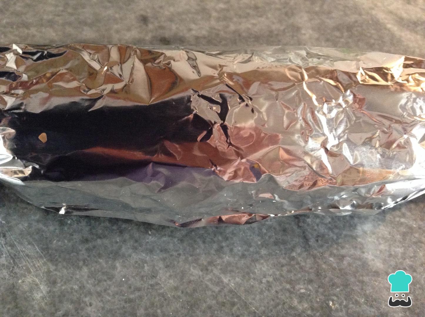 El rollo debe quedar tal y como se observa en la fotografía. Precalienta el horno a 180ºC.