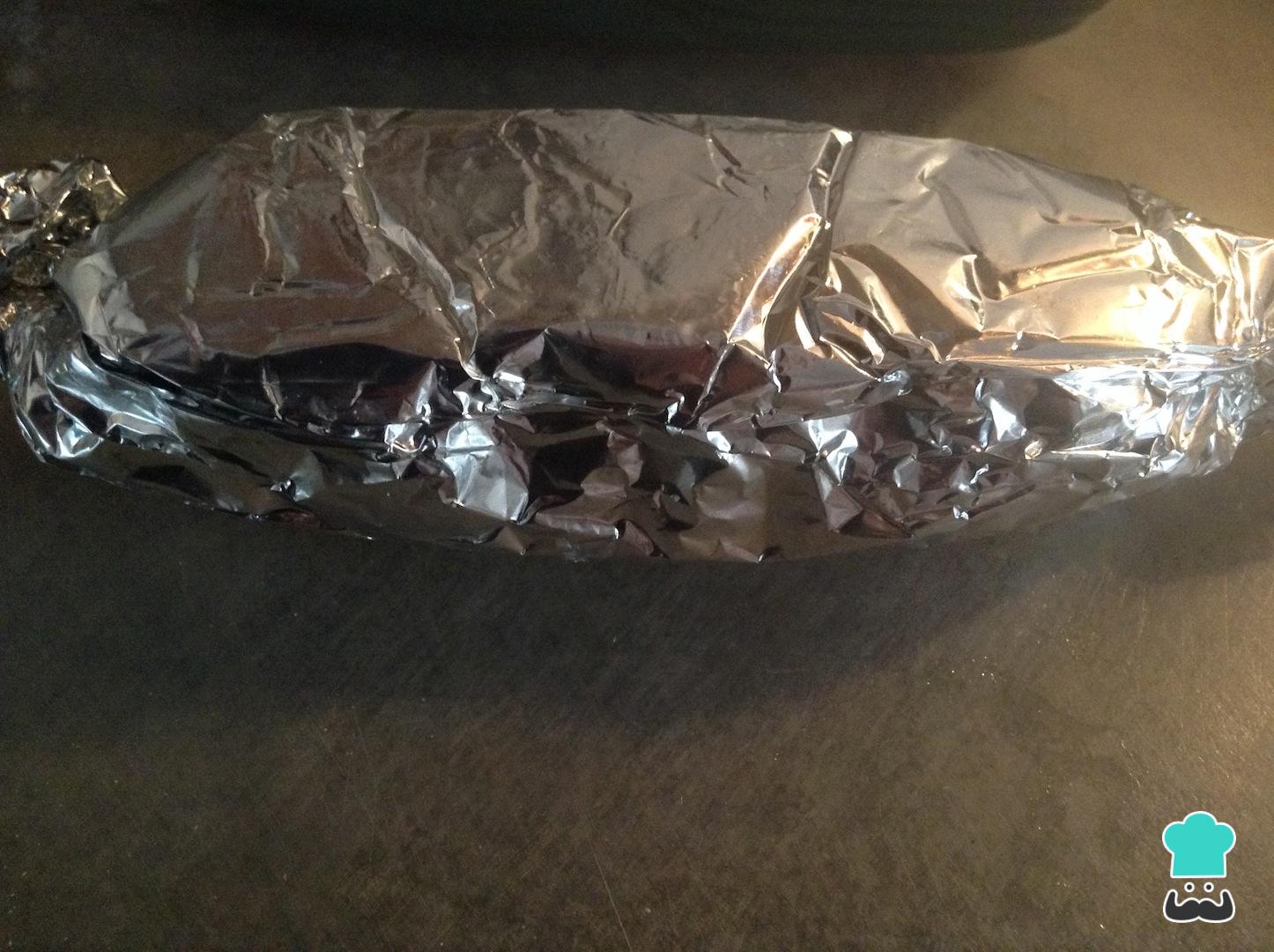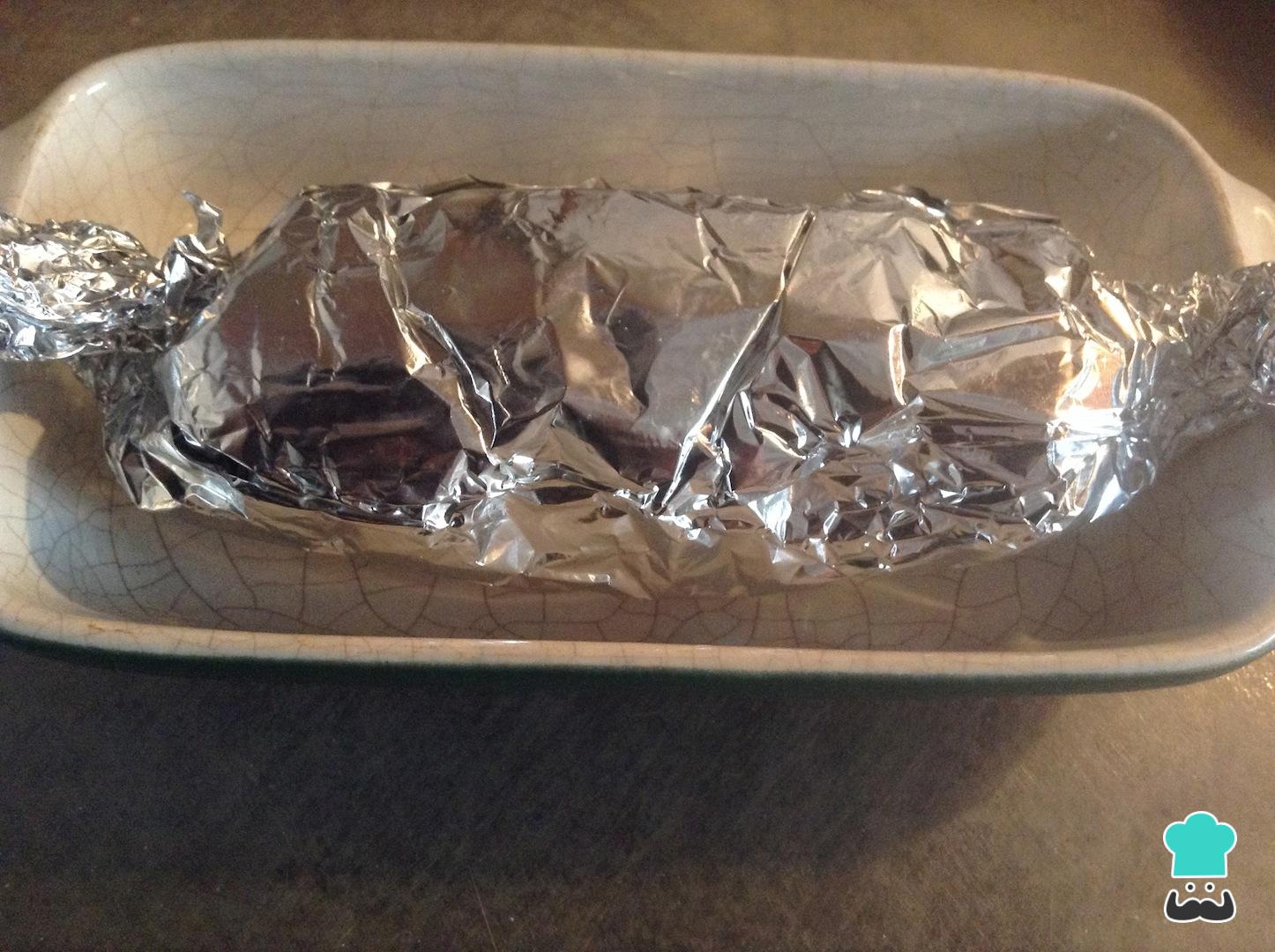 Envuelve el rollo de pollo con papel de aluminio como si de un dulce se tratara. Lo ideal es que quede bien apretado para que tome esa forma redondeada en el horno.