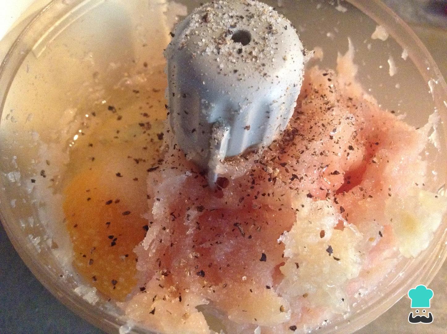 Procesa el pollo con un poco de sal, pimienta negra al gusto y, si deseas, una pizca de ajo en pasta. Procesa hasta que se integren bien los ingredientes de nuestra receta de navidad.