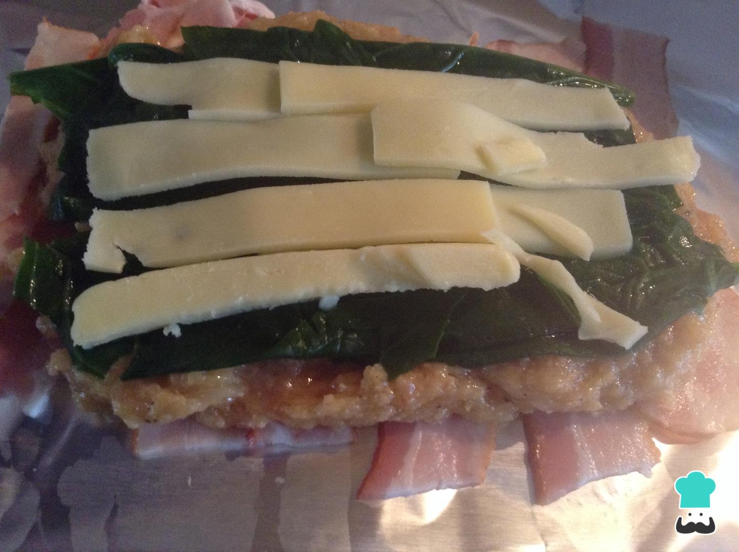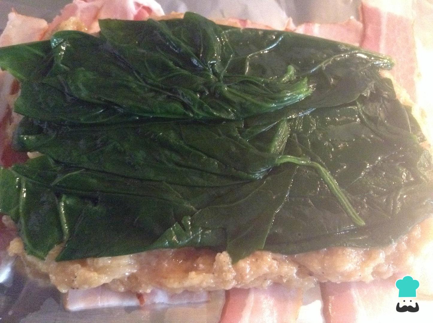 Aañade el queso mozzarella sobre las espinacas para finalizar el relleno. Si lo prefieres, también puedes rellenar el pollo con otros ingredientes que sean de tu elección como frutos secos, tomates secos, pimientos o pimentones ahumados, etc.