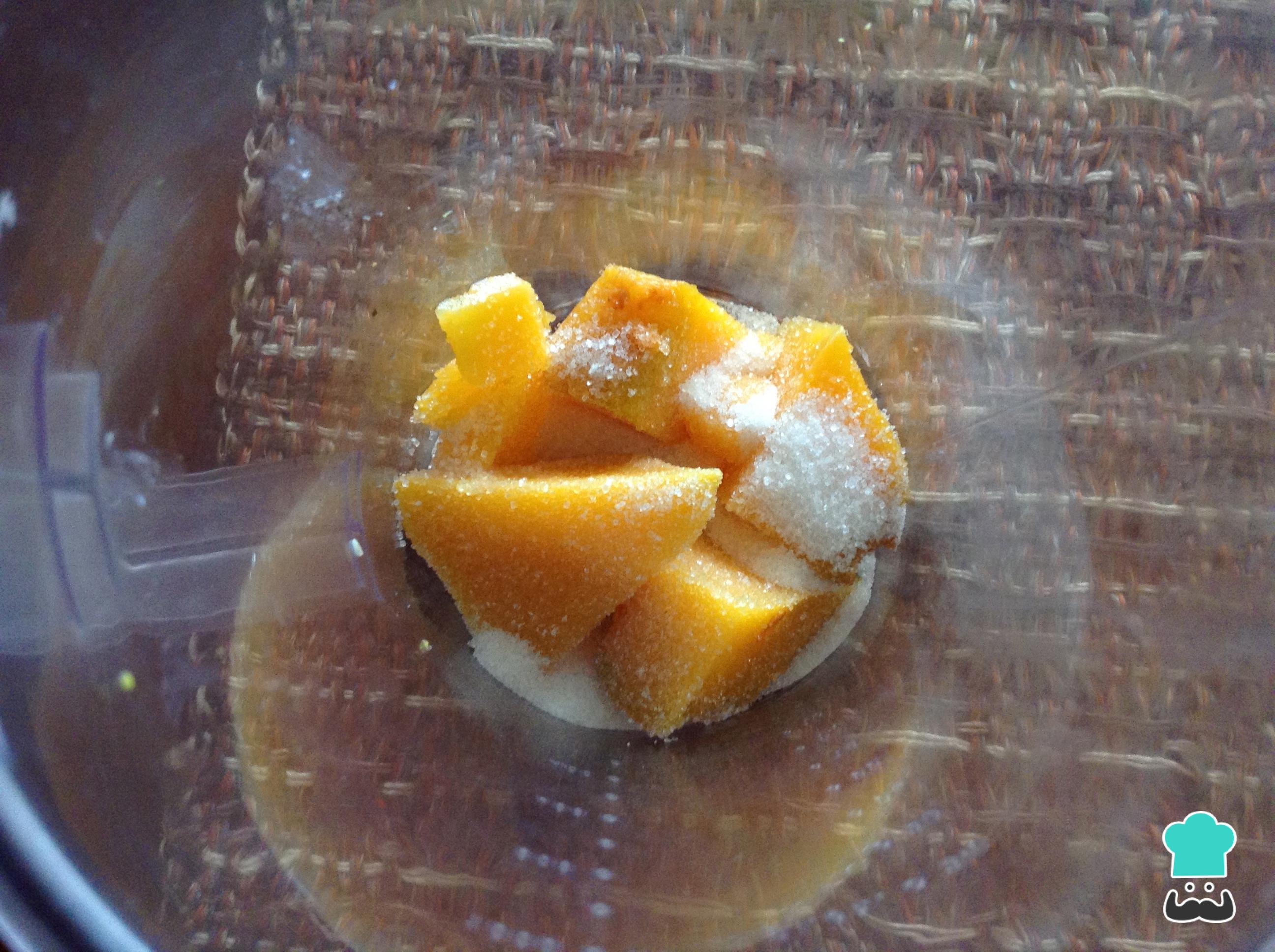 En un bol adiciona la calabaza y dos cucharadas de azúcar blanco. Procesa los ingredientes con un mixer hasta hacer un puré.