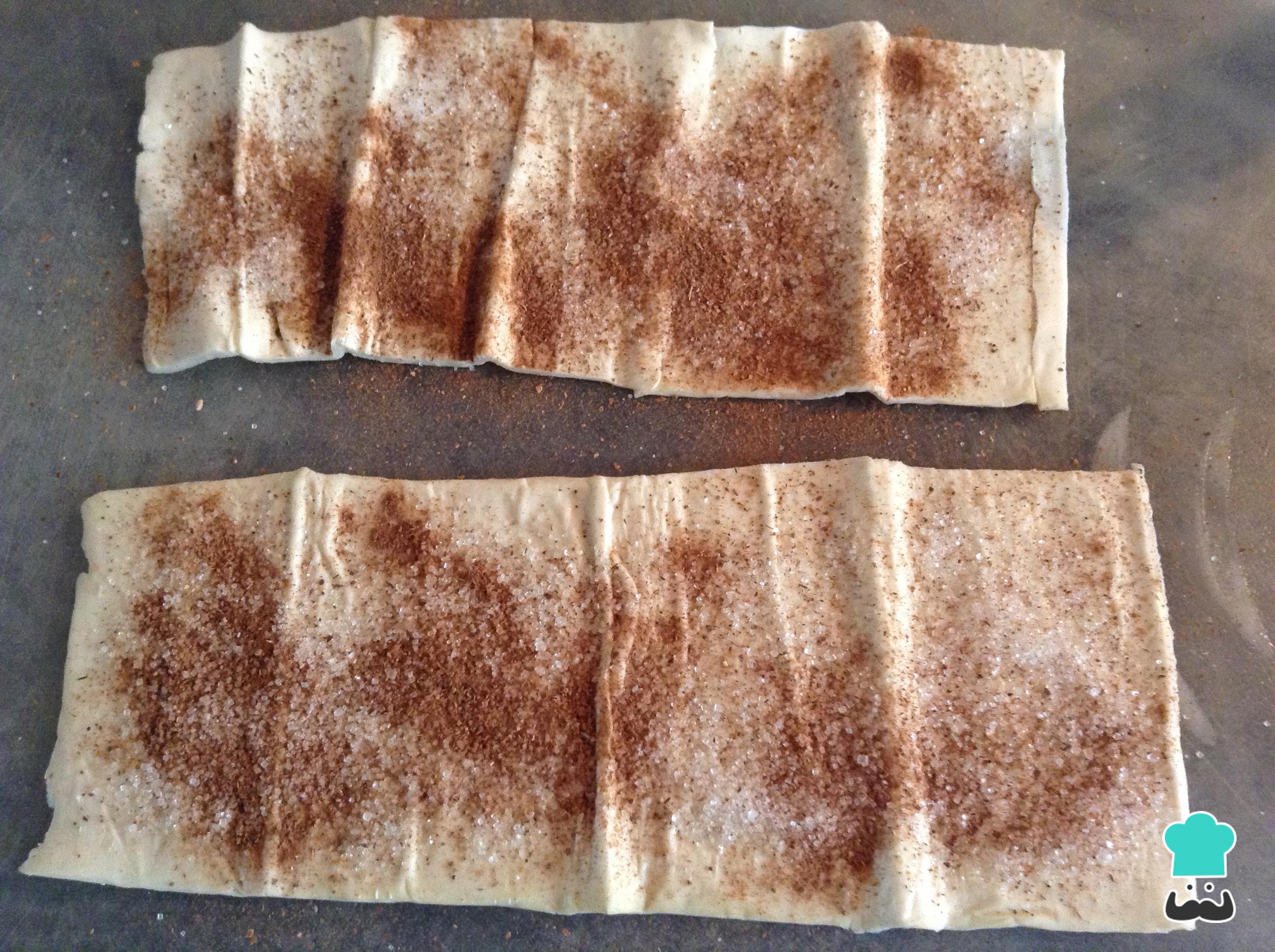 Estira la masa de hojaldre con la ayuda de un rodillo. Sobre ella, espolvorea azúcar y canela en polvo como se observa en la fotografía.