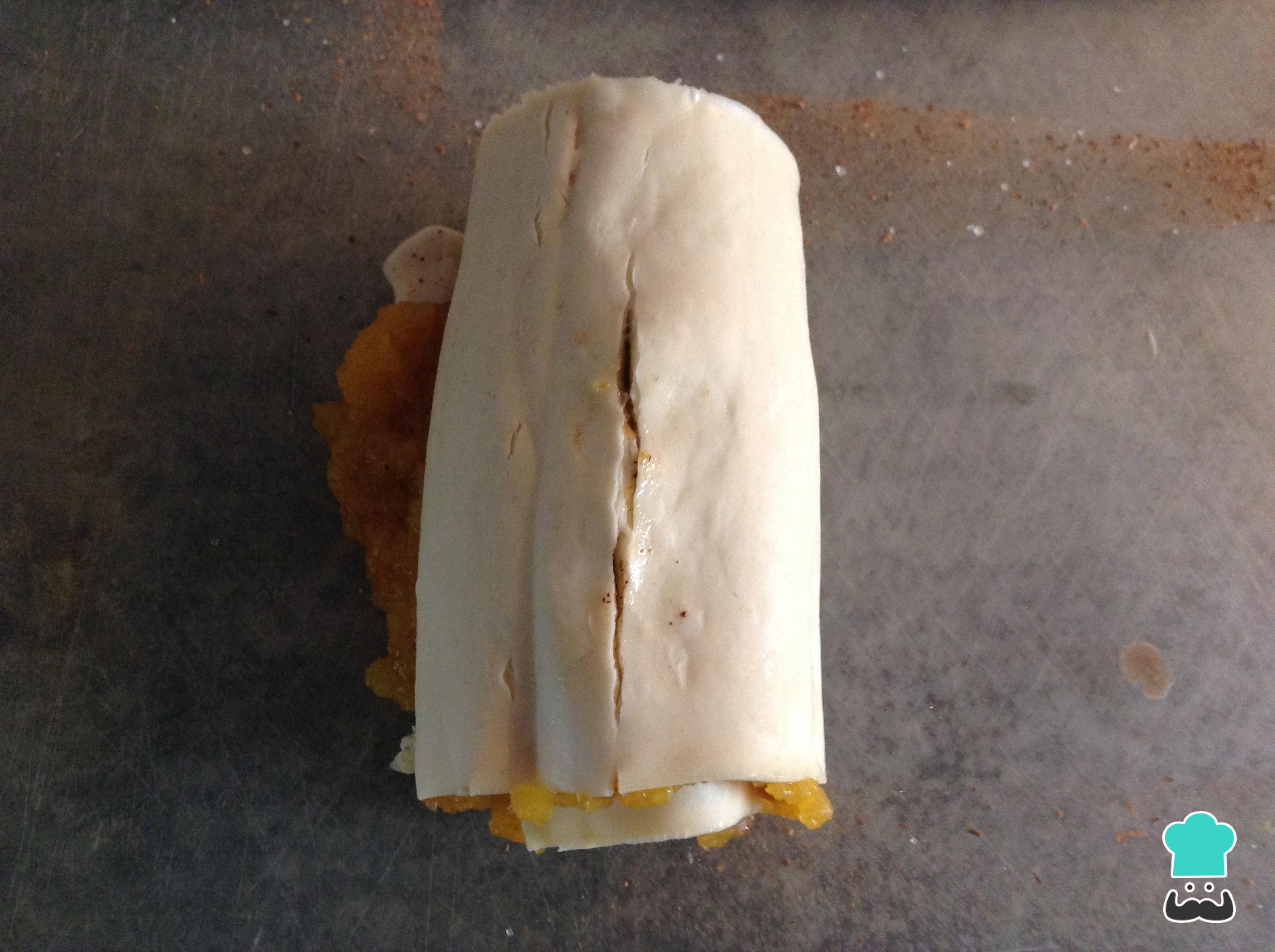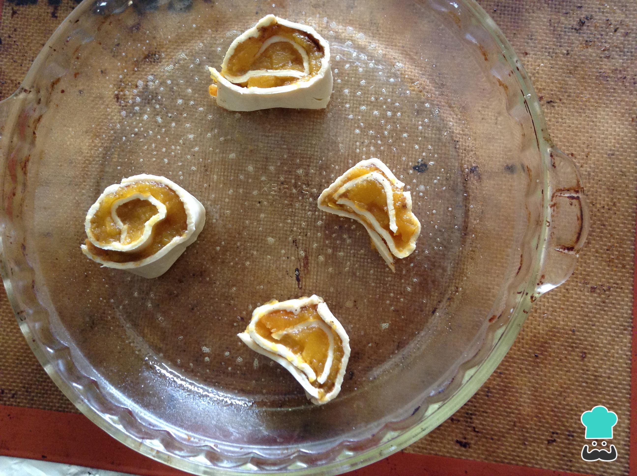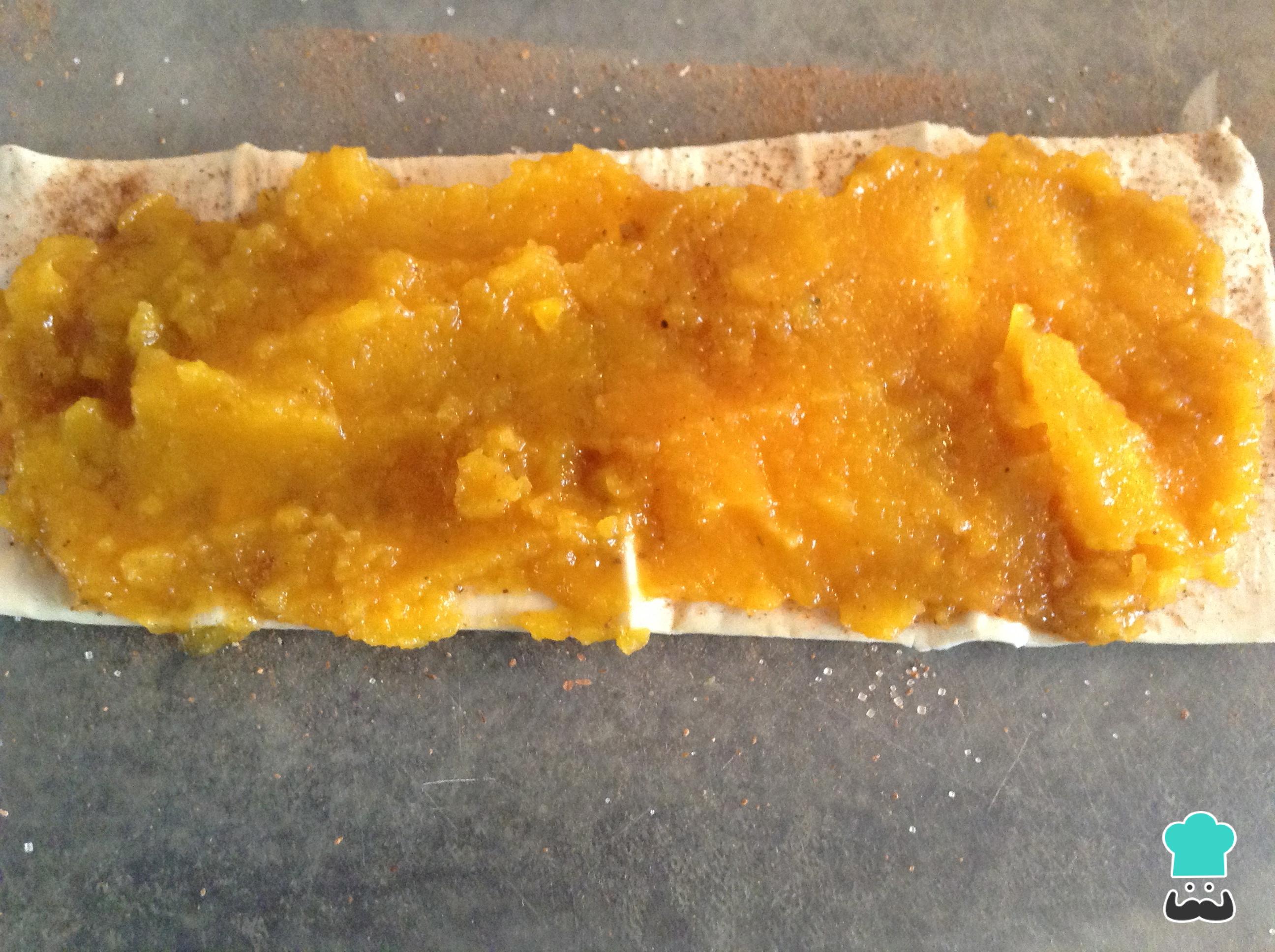 Expande el puré de calabaza sobre la masa de hojaldre de manera uniforme para rellenar los rollos.