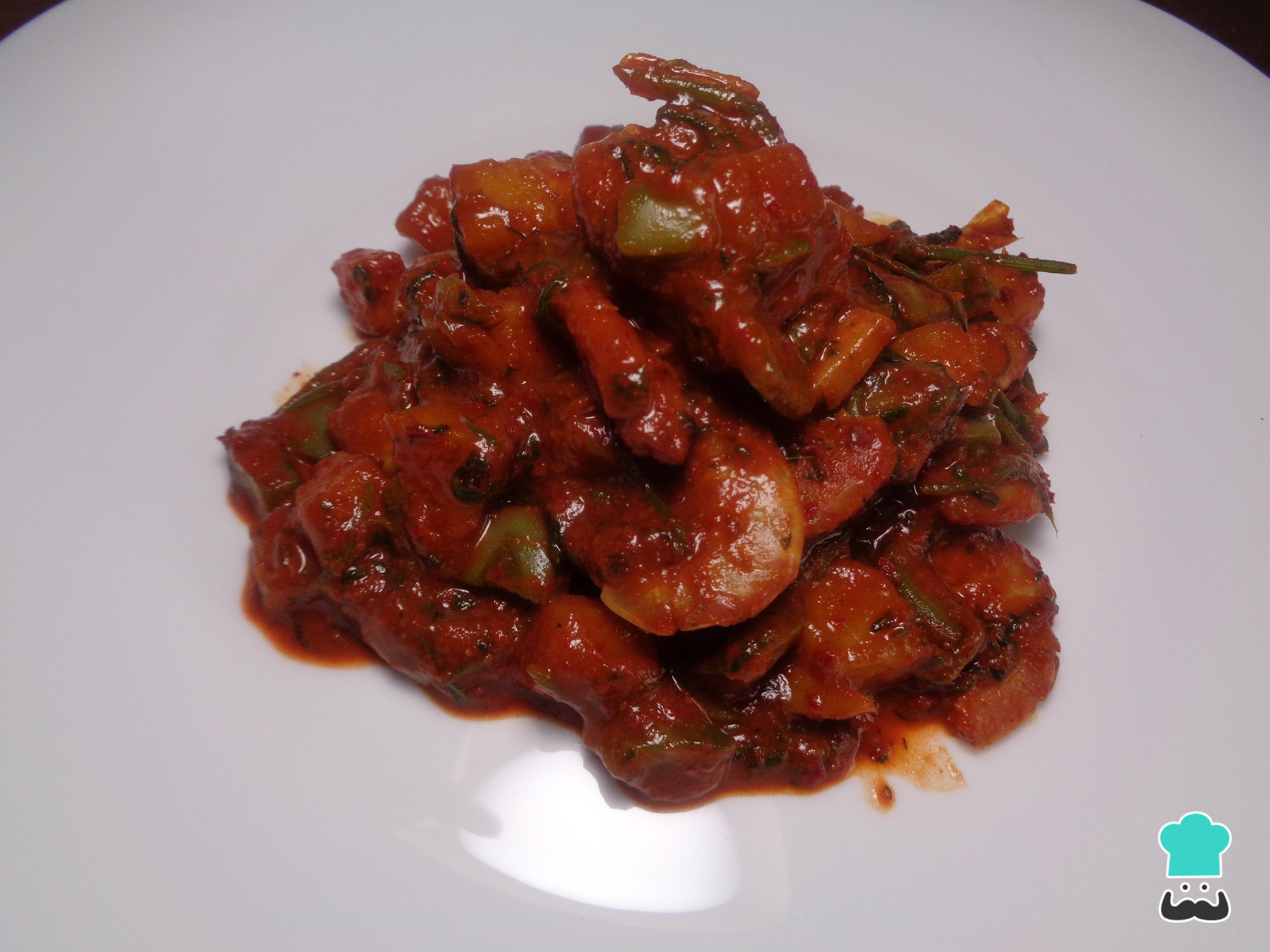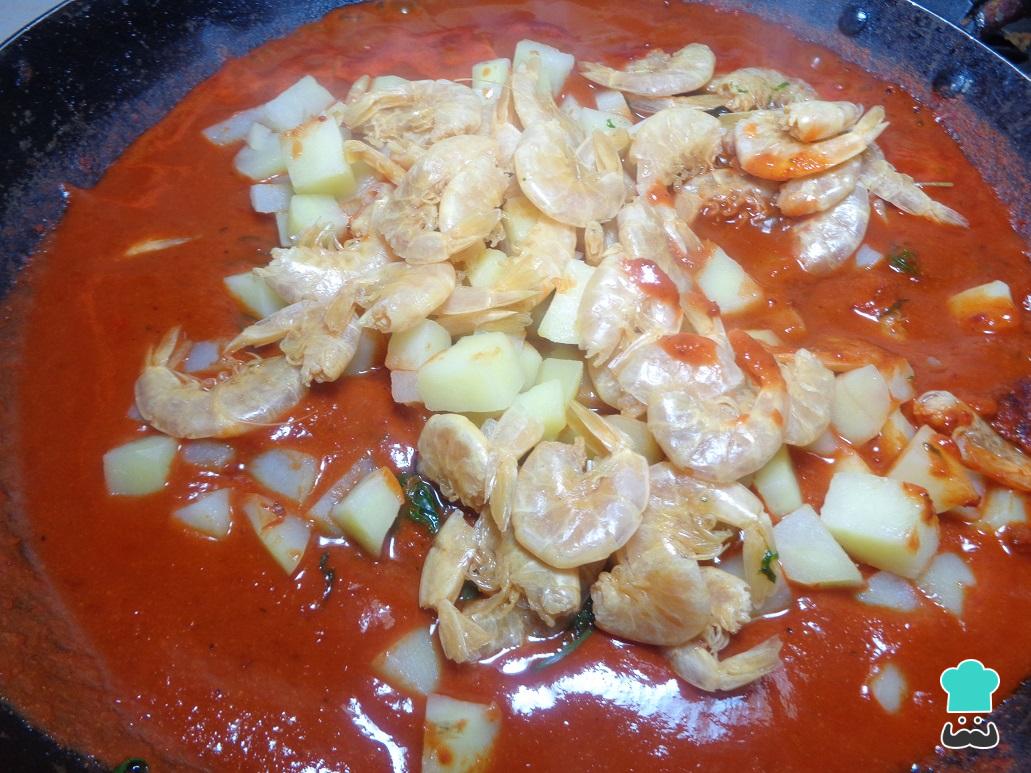 Seguido agregamos las papas cocidas y los camarones a la salsa con los romeros.