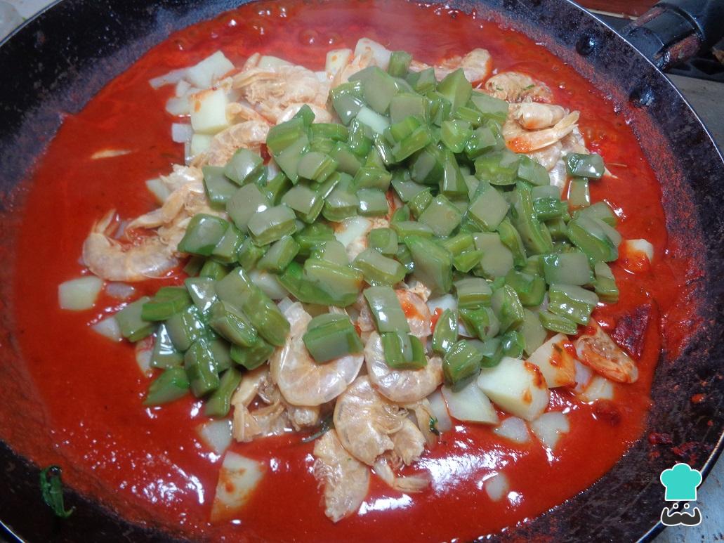 Y para terminar agregamos los nopales cocidos, una vez todos los ingredientes en la salsa incorporamos perfectamente.