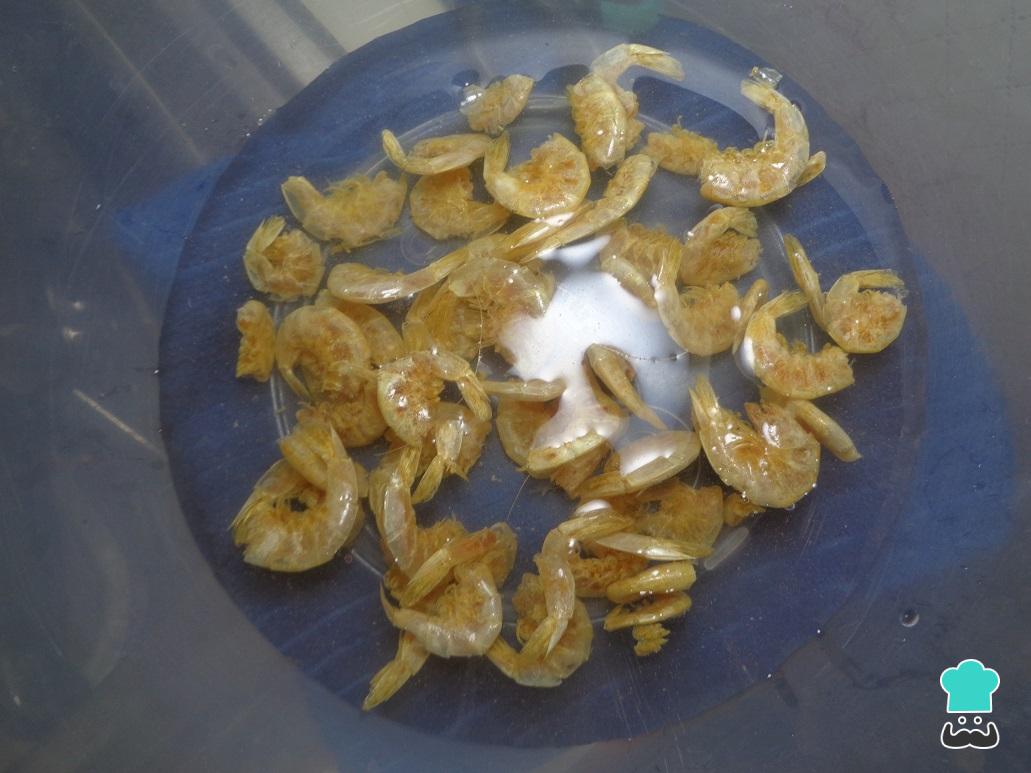 Por un lado, para empezar a preprara los romeritos con camarones, vamos a poner en un tazón profundo con agua los camarones y los dejaremos remojar por aproximadamente 1 hora., esto con la finalidad de desalarlos. Una vez pasado este tiempo retiramos los camarones del agua y los reservamos. No tirar el agua ya que más adelante la utilizaremos en la preparación.
