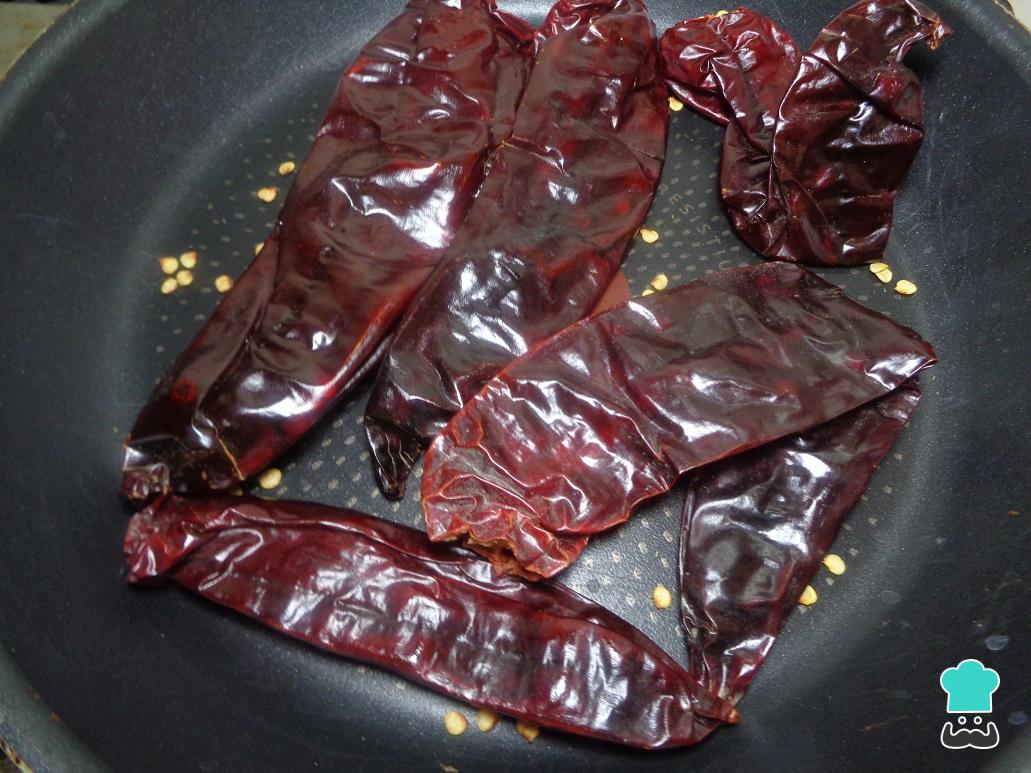 Mientras tanto tomamos los chiles pasilla y los ponemos a dorar en un sartén moviendo constantemente ya que tienden a quemarse muy rápido, así que solo los tenemos en el sartén por 5 minutos y retiramos.