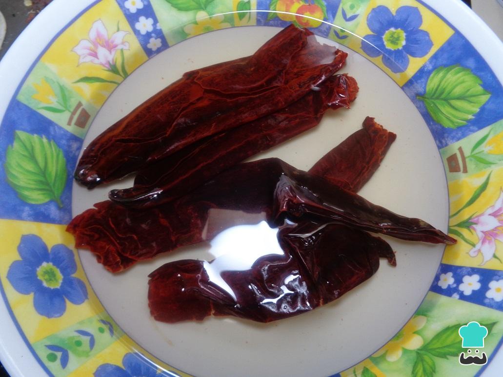 Una vez dorados los chiles los abrimos, los limpiamos muy bien sacándoles las semillas, ya limpios los colocamos en un recipiente con suficiente agua como para cubrirlos y los dejamos remojando aproximadamente 15 minutos.