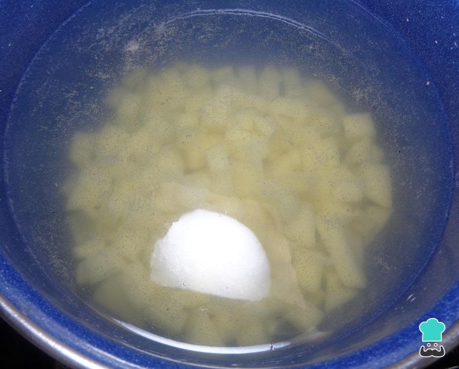 Mientras tanto tomamos las papas, las pelamos, las picamos en pequeños cubos y las colocamos en una cacerola con agua caliente, para que se cuezan muy bien, esto tarda entre 10 y 15 minutos. Una vez listas, las retiramos del agua y reservamos un momento.