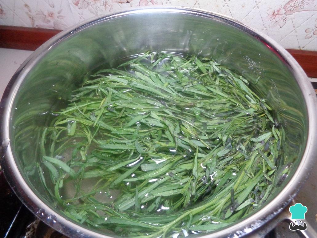 Mientras tanto tomamos los romeritos, los enjuagamos y lavamos perfectamente a chorro de agua y los colocamos en una cacerola con suficiente agua caliente, agregamos una pizca de sal y dejamos que se cuezan por aproximadamente 10 minutos. Una vez listos los retiramos del fuego, drenamos y reservamos un momento.