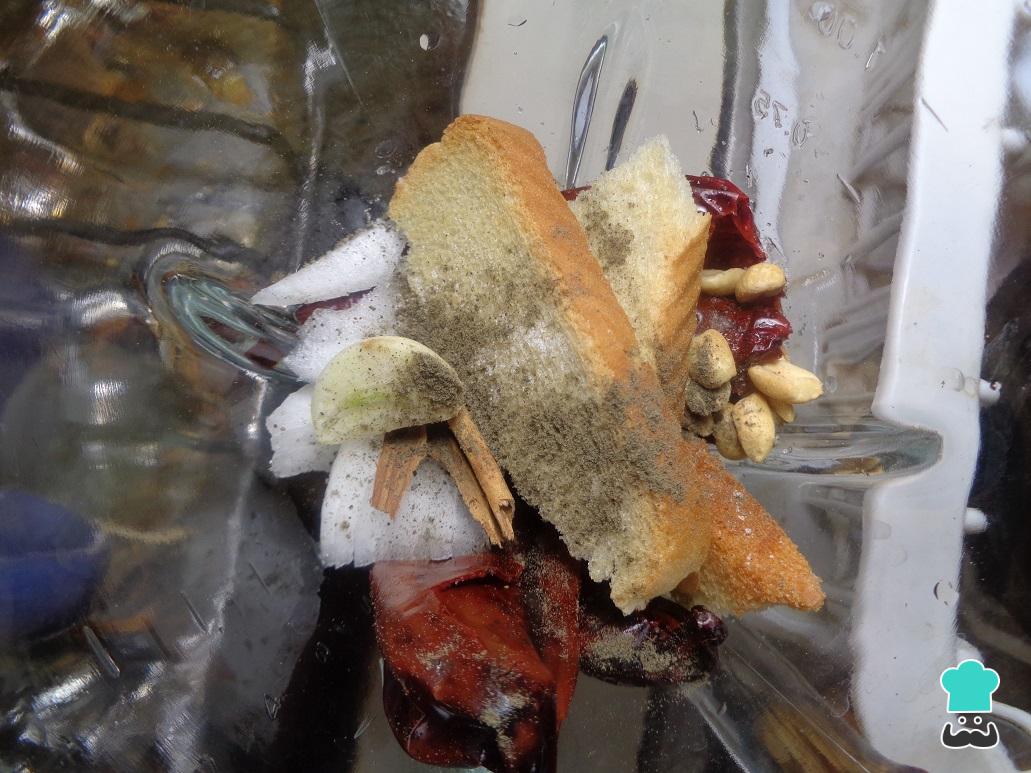 Una vez listos los chiles guajillo, con ellos vamos a hacer la salsa: colocamos estos en la licuadora junto con el pan tostado, los cacahuetes, la cebolla, la canela, el ajo y una pizca de sal y pimienta, agregamos un chorrito del agua en la que se remojaron los chiles, y comenzamos a licuar hasta obtener una salsa homogénea para los romeritos con camarón y nopales.