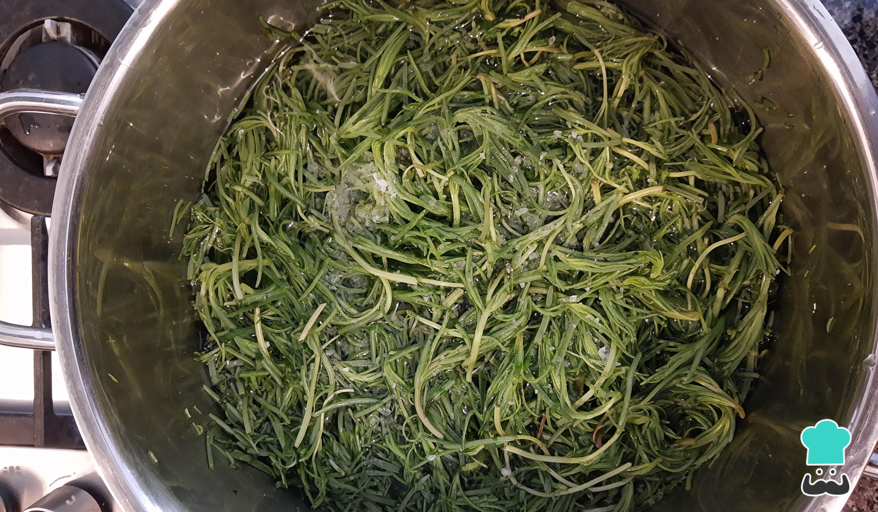 Para comenzar con la receta de romeritos navideños, limpia bien las hojas. Luego, cocina los romeritos con una pizca de sal y con suficiente agua por 20 minutos o hasta que el tallito se ponga muy suave. Deja reposar y reserva.