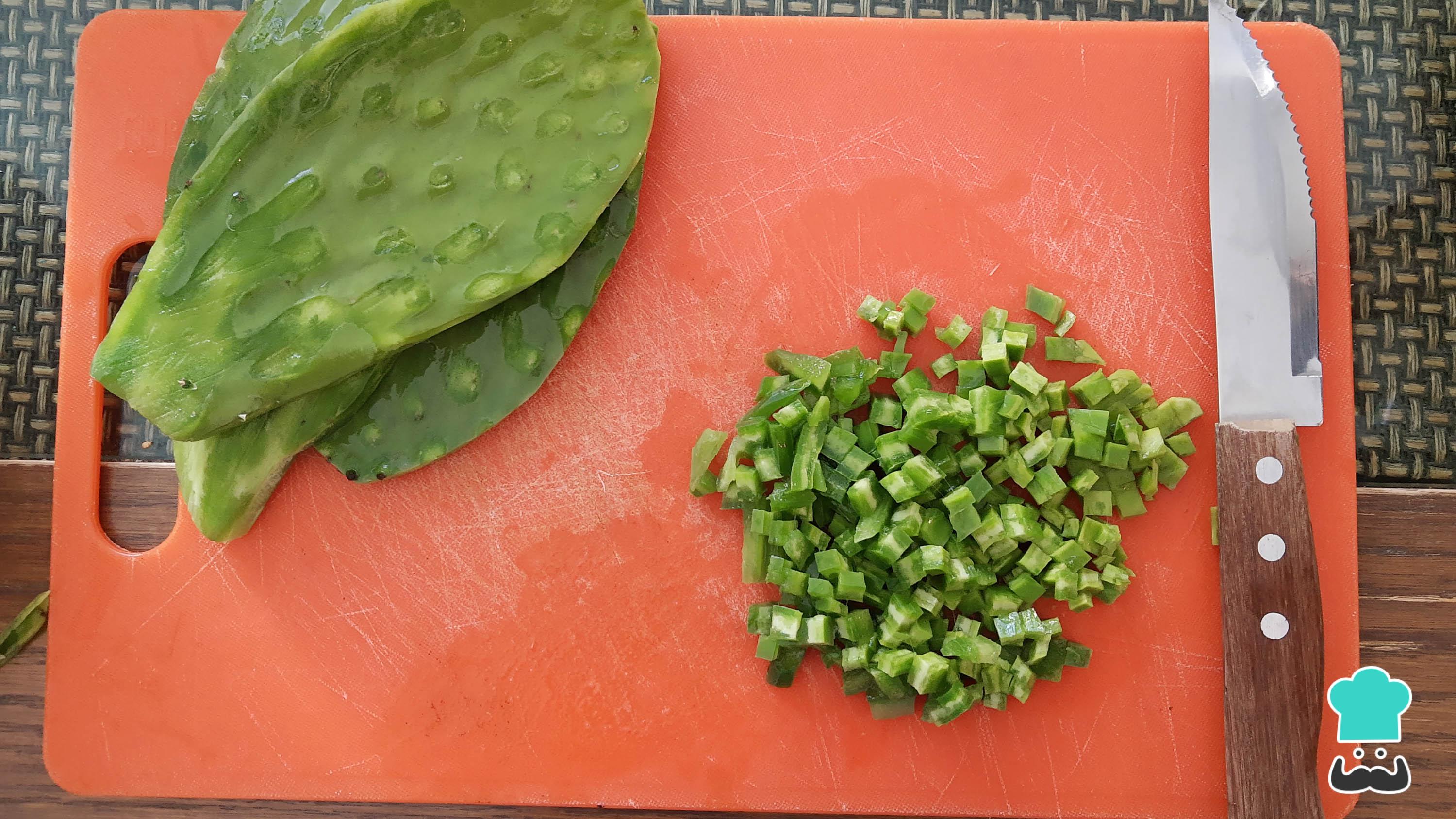 Pica los nopales en cuadritos de 3 mm por 3 mm y cocínalos en 3 tazas de agua con sal al gusto por 15 minutos, luego retíralos del agua y resérvalos.
